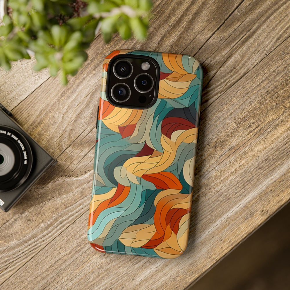 Dit hoesje is voorzien van een abstract patroon met overlappende bladvormen in verschillende kleuren, zoals oranje, teal, beige, bruin en rood. De bladeren zijn gestileerd met gebogen lijnen en onderverdeelde vlakken, wat zorgt voor een vloeiend en dynamisch geheel. Het patroon is dicht en doorlopend en bedekt de volledige achterkant. Het hoesje heeft een glanzende afwerking en is stevig uitgevoerd dankzij een dubbele laag van polycarbonaat en TPU. Dit biedt extra bescherming en maakt draadloos opladen mogelijk.