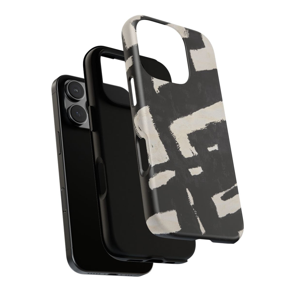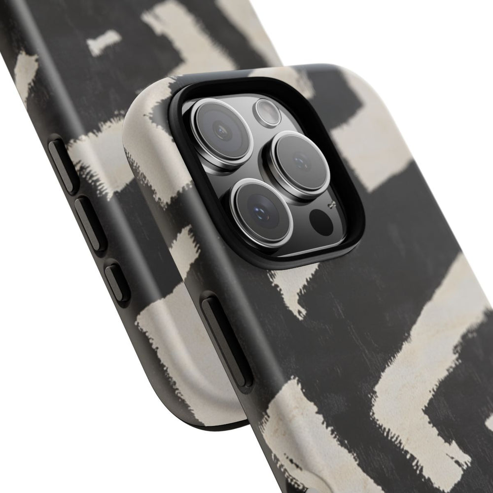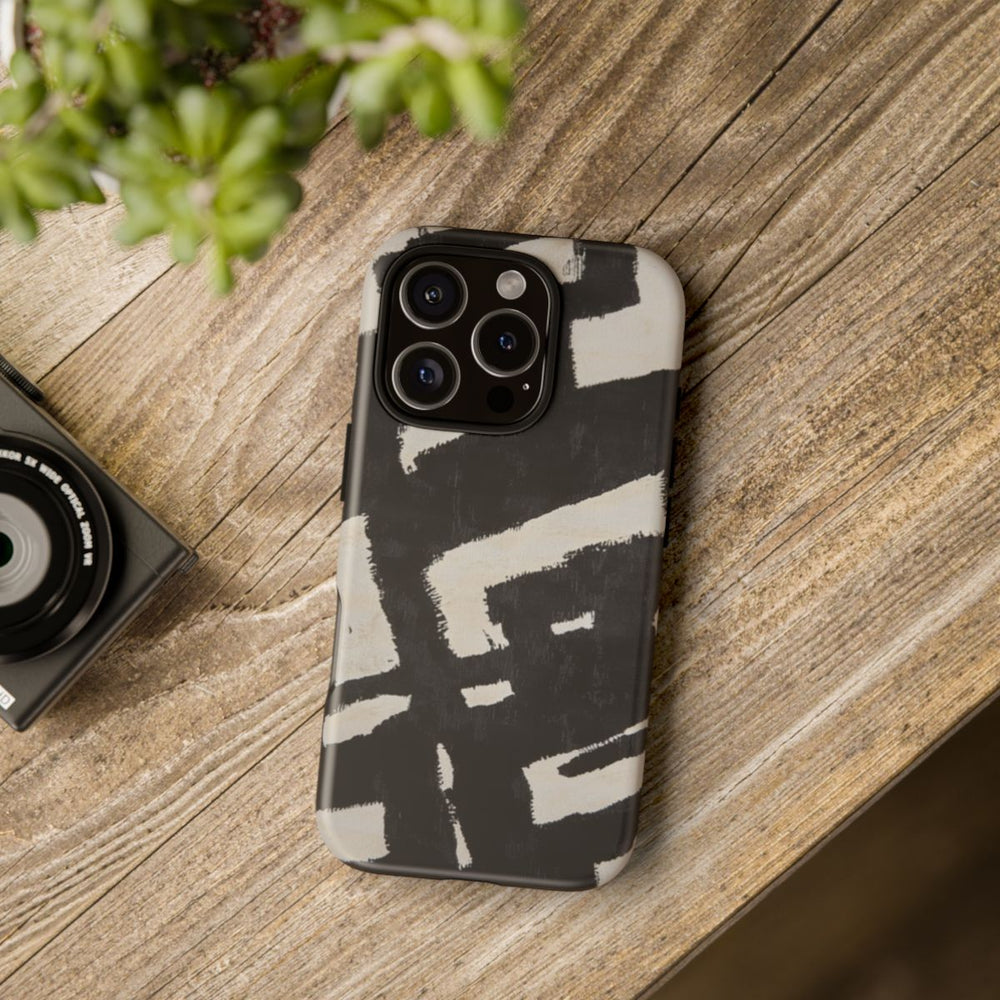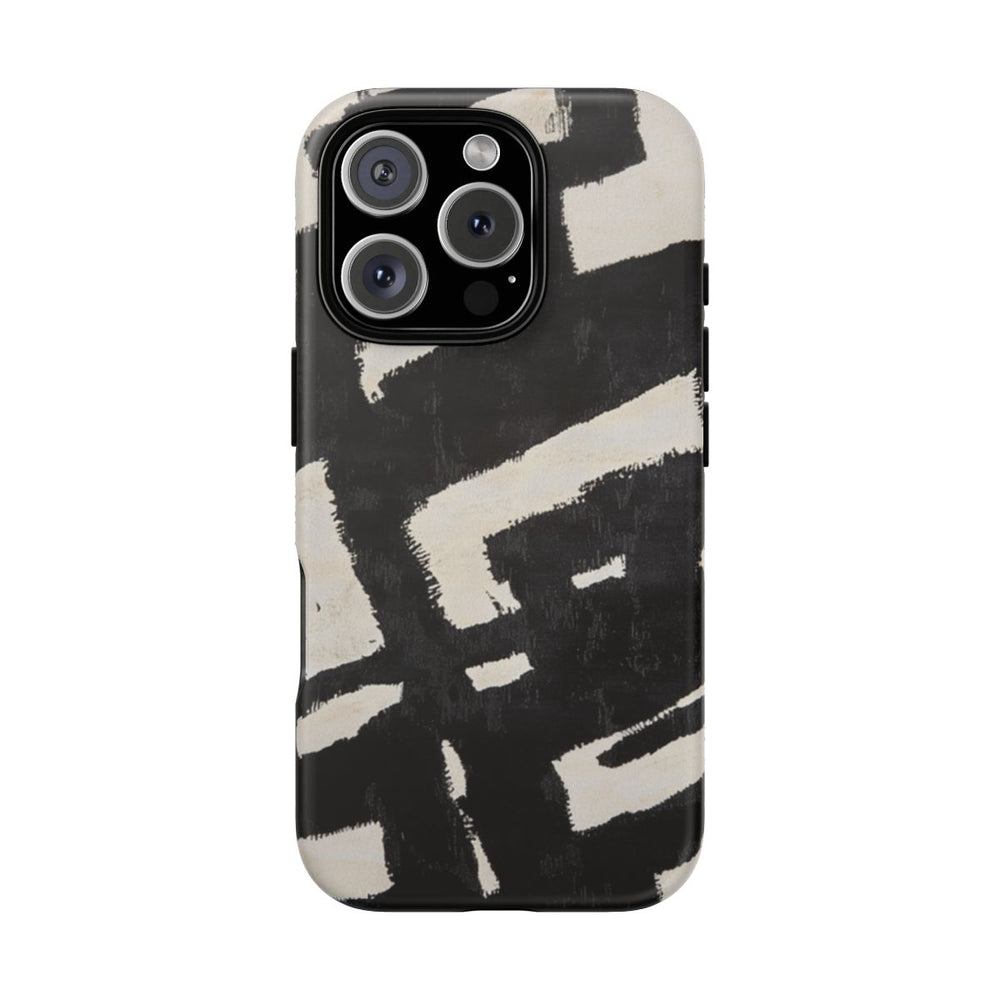 Dit telefoonhoesje heeft een abstract geometrisch patroon met opvallende crèmekleurige vormen op een zwarte achtergrond. De vormen zijn onregelmatig en doen denken aan penseelstreken, wat zorgt voor een minimalistische en moderne uitstraling. Het patroon is gedrukt op een mat hoesje met een stevige polycarbonaat buitenkant en een TPU binnenzijde, speciaal ontworpen voor extra stevigheid en bescherming. Het hoesje ondersteunt draadloos opladen en is bestand tegen invloeden van buitenaf.