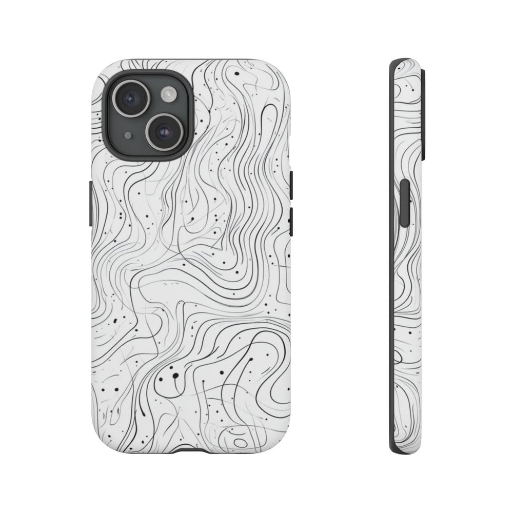 Dit hoesje heeft een abstract ontwerp met vloeiende, golvende zwarte lijnen op een witte achtergrond. De lijnen verschillen in dikte en lopen soepel over het oppervlak, wat zorgt voor een gevoel van beweging en dynamiek. Kleine zwarte stippen zijn verspreid over het patroon, waardoor er extra textuur en visuele diepte ontstaat. Het patroon is dicht en gelijkmatig verdeeld over het gehele hoesje. Deze print is aangebracht op een mat hoesje van polycarbonaat en TPU, dat bestaat uit twee lagen en geschikt is voor draadloos opladen.