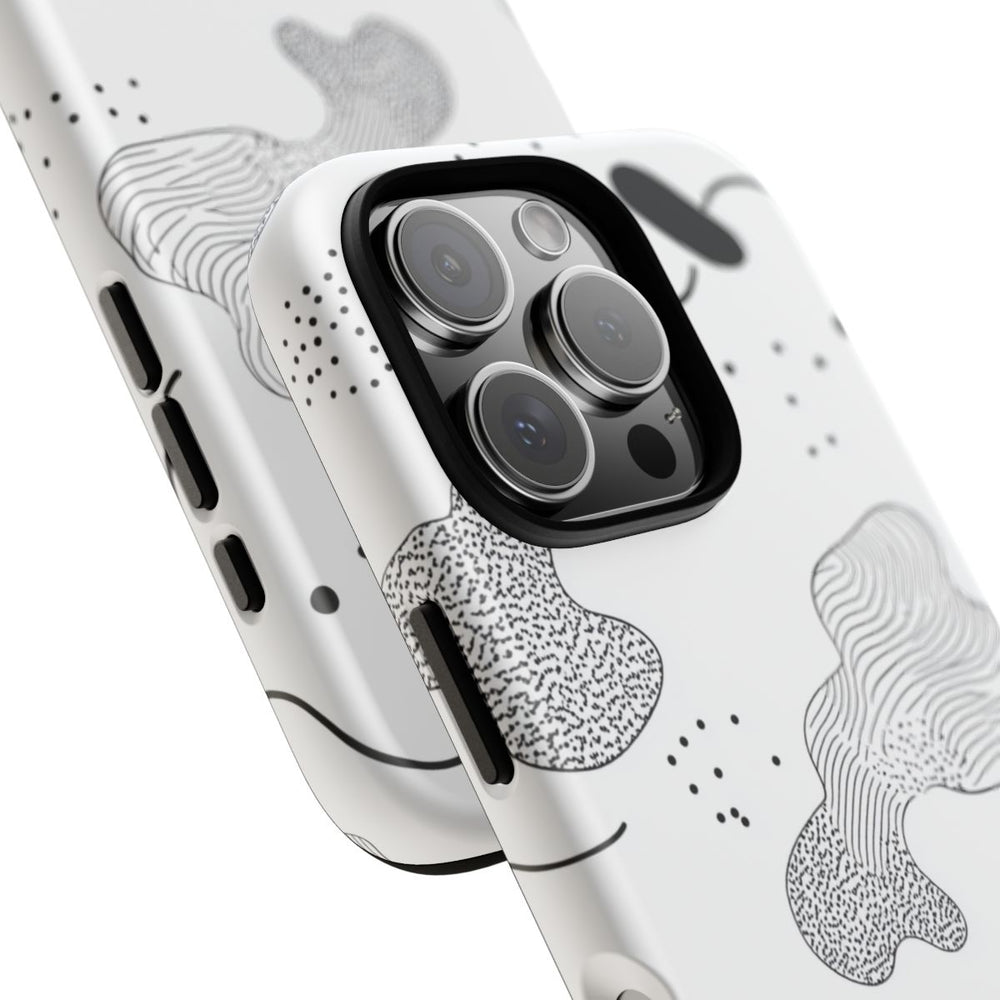 Dit hoesje heeft een abstract, minimalistisch patroon in zwart en wit. Het ontwerp bestaat uit onregelmatige organische vormen met fijne lijnen en stippen, verspreide effen zwarte cirkels en gebogen lijnen op een witte achtergrond. Het patroon oogt ruimtelijk en is getekend in een handgemaakte stijl, wat zorgt voor een moderne en strakke uitstraling. Het stevige, matte hoesje bestaat uit twee lagen van polycarbonaat en TPU. Het ondersteunt draadloos opladen en is bestand tegen diverse weersomstandigheden.