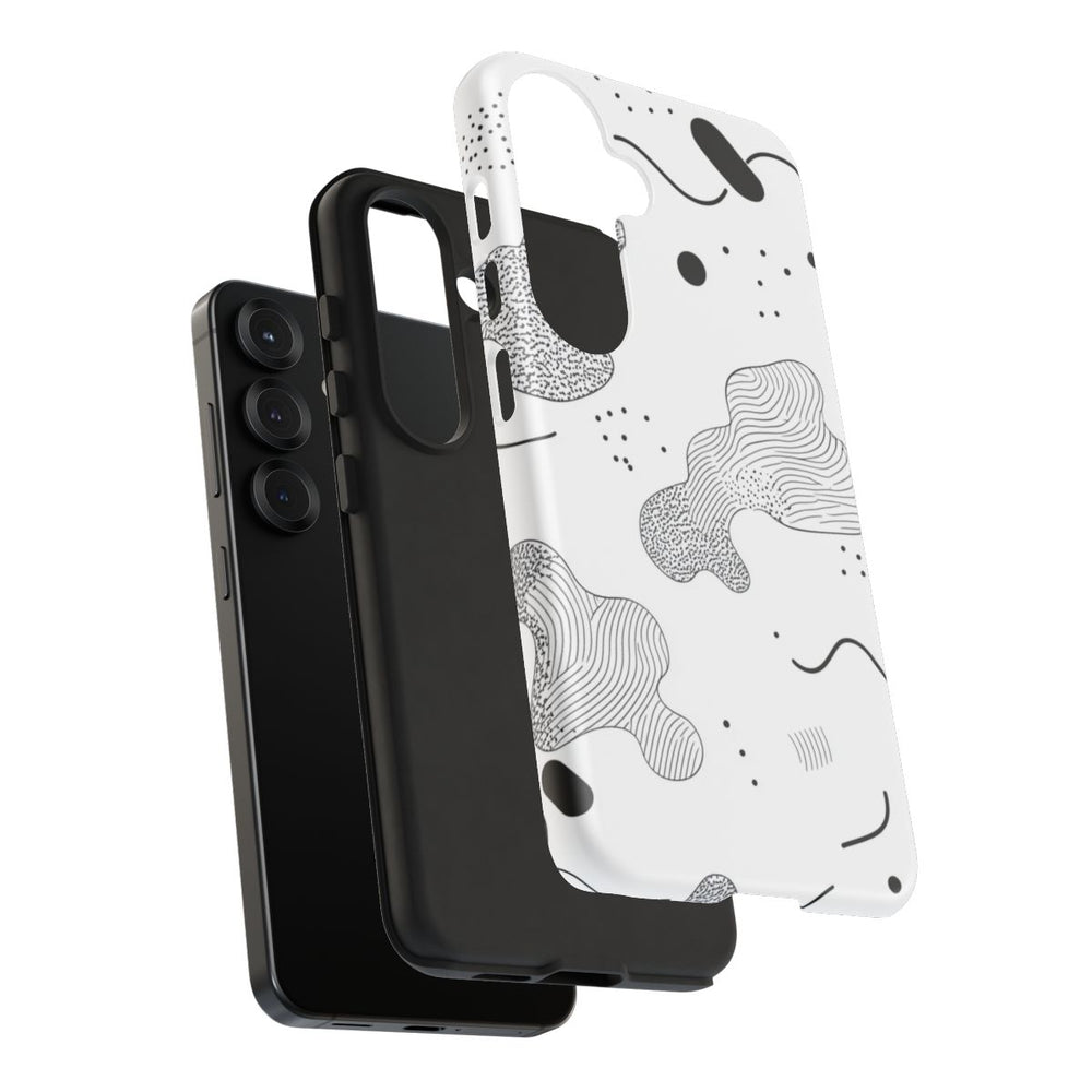 Dit telefoonhoesje heeft een abstract zwart-wit minimalistisch patroon met organische vormen, stippen en gebogen lijnen die speels over een witte achtergrond zijn verdeeld. De vormen bestaan uit getextureerde vlekken met fijne lijnen en gespikkelde patronen, afgewisseld met effen zwarte cirkels en langwerpige ovalen. De stijl oogt ruimtelijk en handgetekend, wat zorgt voor een moderne en kunstzinnige uitstraling. Het hoesje is dubbel gelaagd met een stevige polycarbonaat buitenkant en een TPU binnenzijde. Ondersteunt draadloos opladen en is bestand tegen verschillende weersomstandigheden.