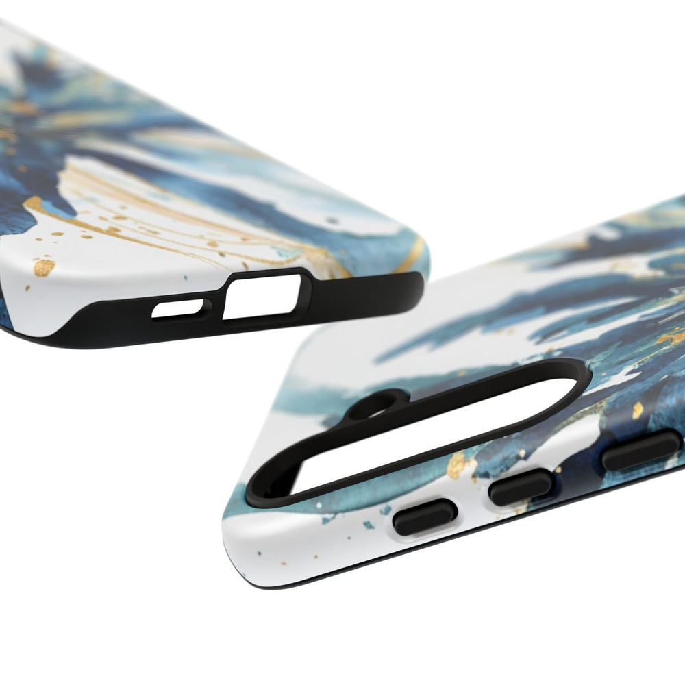 Dit telefoonhoesje heeft een abstract bloemenpatroon in waterverf met diepblauwe en teal penseelstreken die in een dynamisch patroon naar buiten lopen. Gouden accenten en fijne lijnen geven het ontwerp een elegante uitstraling. De afbeelding staat op een stralend witte achtergrond. Het hoesje heeft een matte afwerking en is extra stevig dankzij een polycarbonaat buitenkant en TPU binnenzijde. Geschikt voor draadloos opladen.