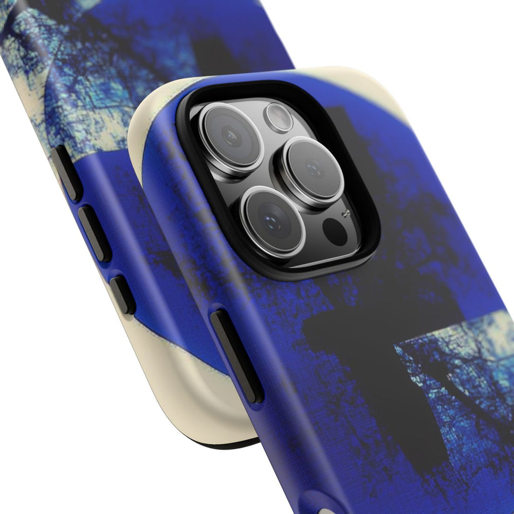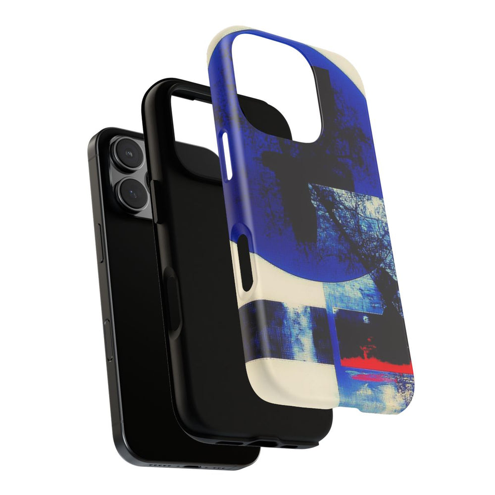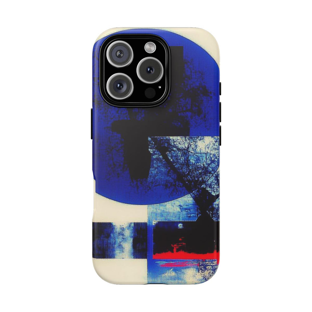 Dit hoesje heeft een abstract ontwerp met een grote blauwe cirkel en meerdere zwarte rechthoekige vormen. Binnen deze vormen is een patroon zichtbaar dat doet denken aan boomtakken, wat zorgt voor extra diepte en detail. Onderaan rechts is een opvallend rood accent toegevoegd, wat mooi contrasteert met het overwegend blauwe en zwarte kleurgebruik. De zachte, gebroken witte achtergrond laat de geometrische vormen en texturen goed uitkomen. Het ontwerp is gedrukt op een stevig mat hoesje met dubbele lagen voor optimale bescherming en is geschikt voor draadloos opladen.
