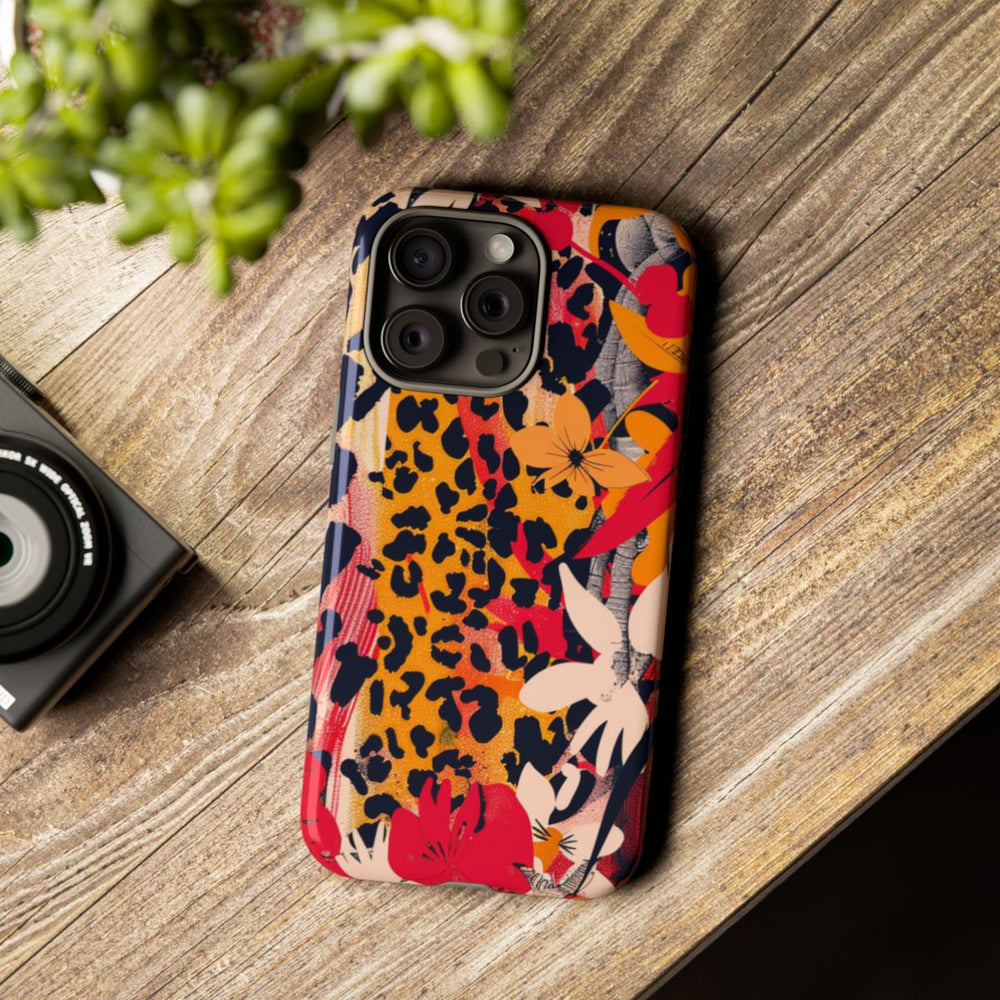 Dit hoesje heeft een opvallend ontwerp met een levendige mix van abstracte dierenprints en bloemmotieven. Het patroon bestaat uit gedurfde zwarte vlekken die doen denken aan panter- en andere dierenprints, gecombineerd met grote, kleurrijke bloemen in rood-, oranje- en crèmetinten. De achtergrond heeft een getextureerde uitstraling met warme kleuren zoals oranje en rood. Dit glanzende, stevige hoesje is gemaakt van een polycarbonaat buitenkant en een TPU binnenzijde, waardoor het een dubbele beschermlaag biedt en geschikt is voor draadloos opladen. De stijl is levendig en dynamisch, ideaal voor liefhebbers van uitgesproken en artistieke patronen.