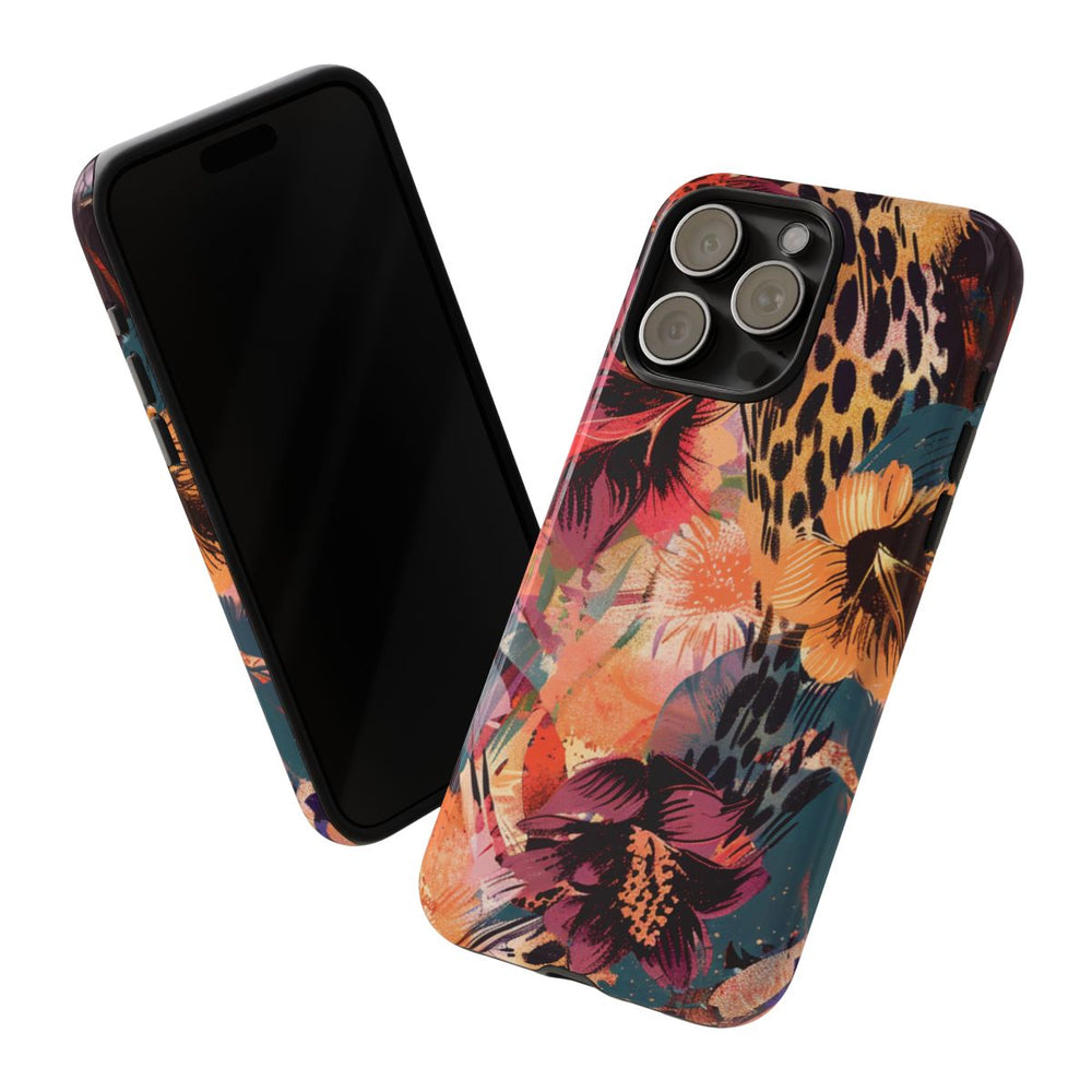 Dit hoesje heeft een opvallend abstract patroon waarin bloemmotieven worden gecombineerd met dierenprintdetails. Grote bloemen in oranje, roze en paars zijn speels gemixt met zwarte en beige vlekken. Verschillende penseelstreken en bladachtige vormen zorgen voor extra diepte en beweging in het ontwerp. Het hoesje bestaat uit twee lagen van polycarbonaat en TPU met een glanzende afwerking, waardoor het stevig is en optimale bescherming biedt. Geschikt voor draadloos opladen. Het geheel oogt artistiek en levendig met een warme kleurencombinatie.