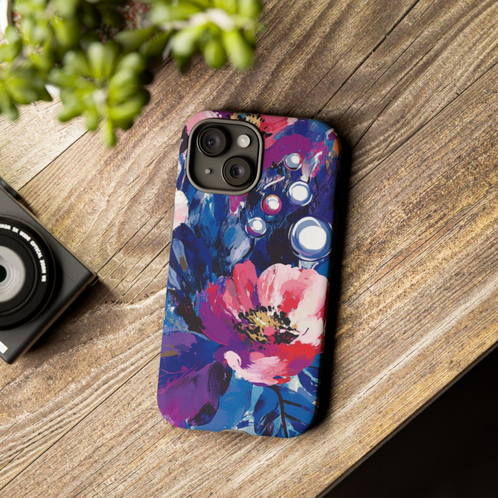 Dit hoesje heeft een abstracte, impressionistische stijl met grote, expressieve bloemen in tinten roze, wit en rood. Diepblauwe en paarse bladeren vormen een rijk gekleurde achtergrond. Verspreid over het ontwerp zorgen parelachtige bollen voor een glanzend, reflecterend effect. De levendige en dynamische print is aangebracht op een stevige hoes met dubbele laag van polycarbonaat en TPU. Het hoesje is duurzaam en geschikt voor draadloos opladen.