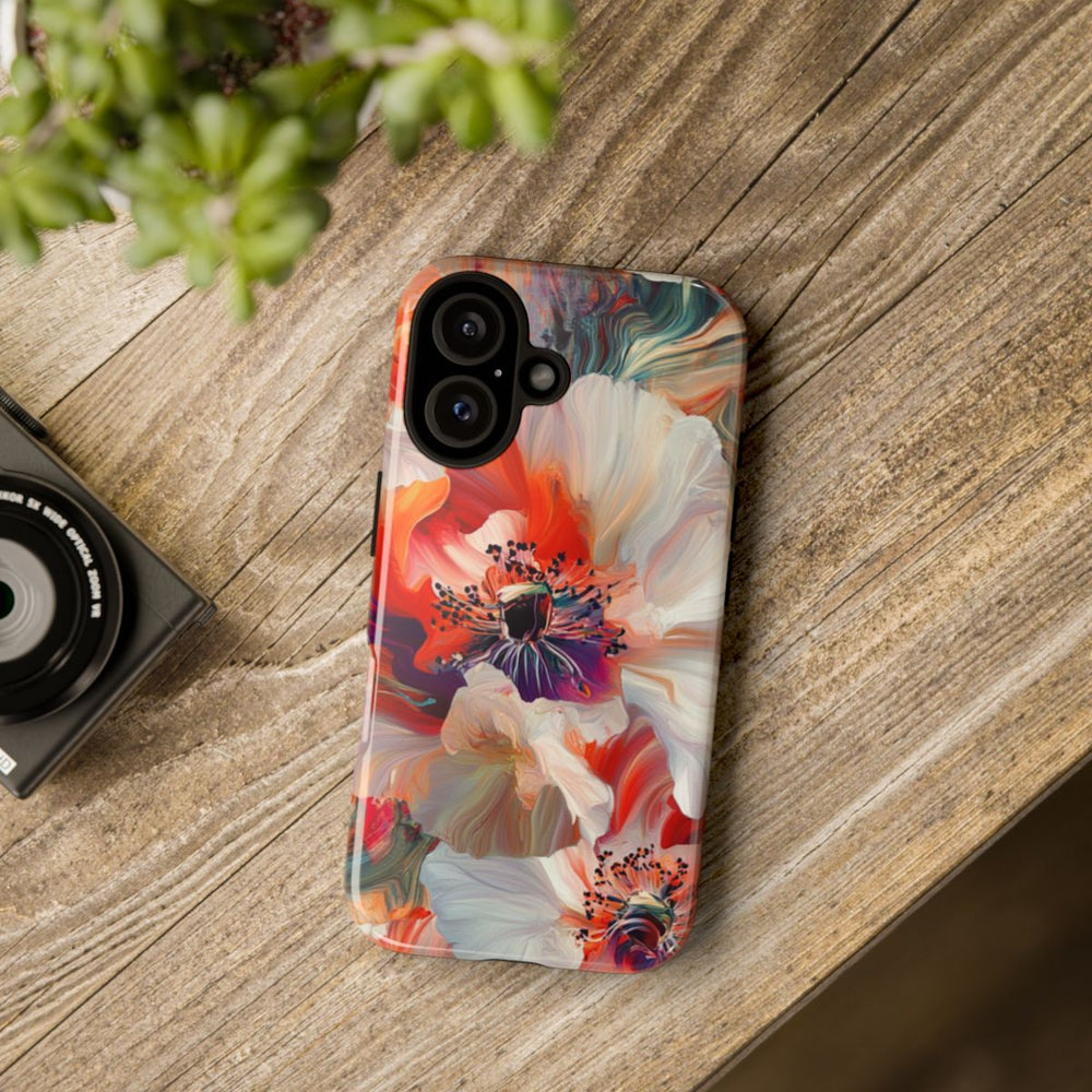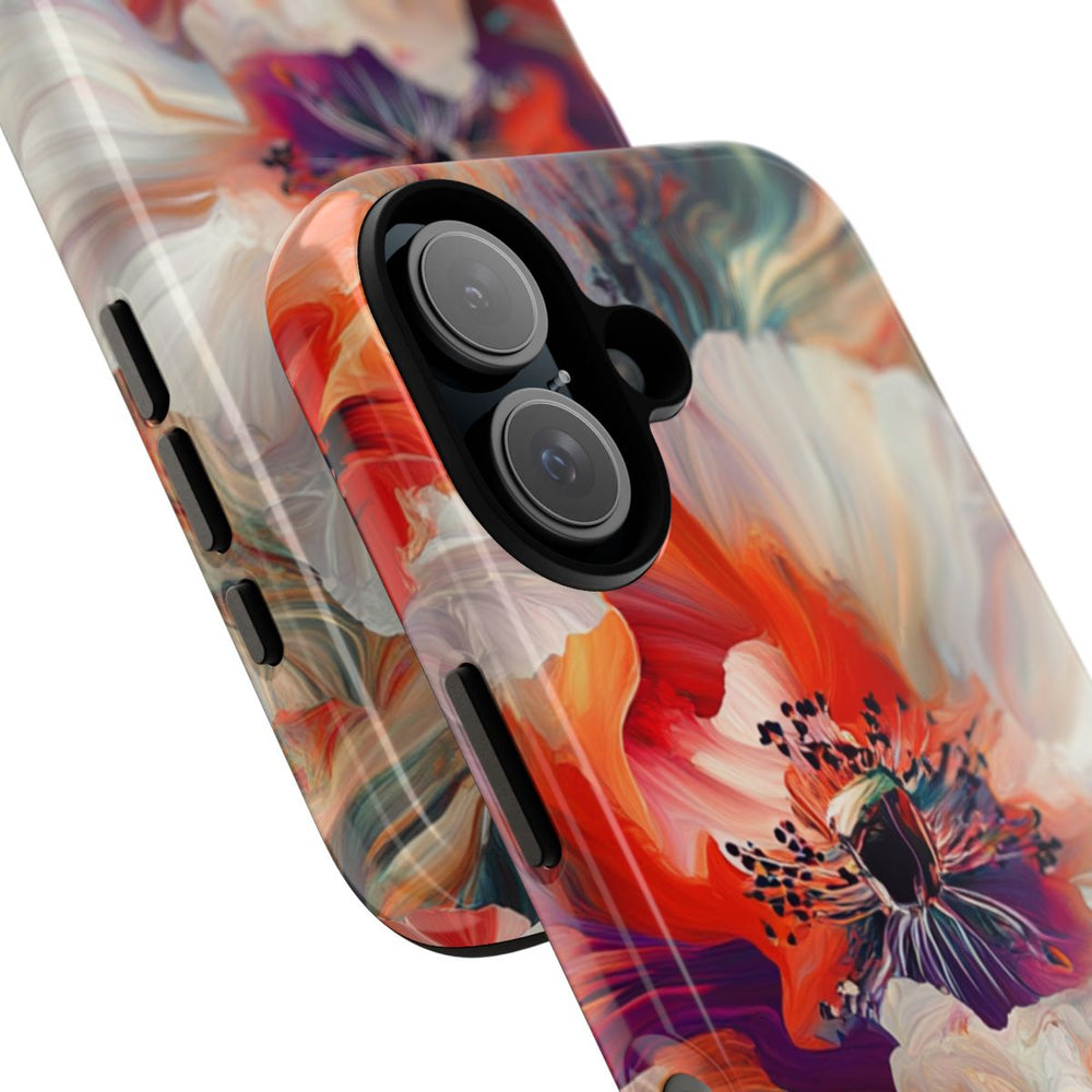 Dit telefoonhoesje is voorzien van een opvallend ontwerp met grote, abstracte bloemen en vloeiende, schilderachtige bloemblaadjes in rood-, wit- en oranje tinten. De bloemblaadjes hebben een getextureerde, draaiende uitstraling die overloopt in een veelkleurige achtergrond met accenten van groen, paars en beige. De bloemen zijn afgewerkt met donkere harten en verfijnde meeldraden. De afbeelding is gedrukt op een glanzend, stevig hoesje van polycarbonaat en TPU, dat uit twee lagen bestaat voor extra bescherming en geschikt is voor draadloos opladen.