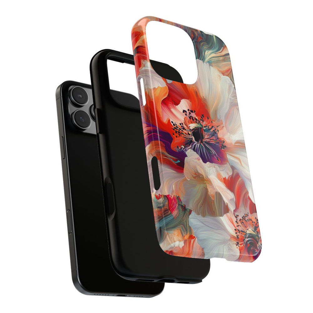 Dit telefoonhoesje is voorzien van een opvallend ontwerp met grote, abstracte bloemen en vloeiende, schilderachtige bloemblaadjes in rood-, wit- en oranje tinten. De bloemblaadjes hebben een getextureerde, draaiende uitstraling die overloopt in een veelkleurige achtergrond met accenten van groen, paars en beige. De bloemen zijn afgewerkt met donkere harten en verfijnde meeldraden. De afbeelding is gedrukt op een glanzend, stevig hoesje van polycarbonaat en TPU, dat uit twee lagen bestaat voor extra bescherming en geschikt is voor draadloos opladen.
