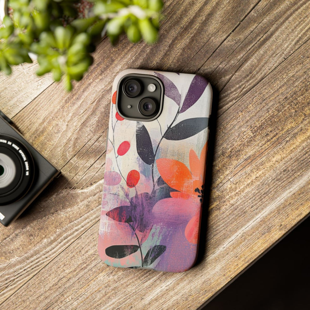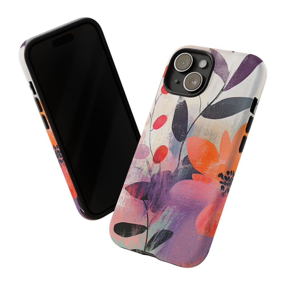 Dit hoesje is voorzien van een abstract ontwerp met organische bloemvormen, gelaagde texturen en zachte penseelstreken. De afbeelding combineert gedempte tinten roze, oranje, paars en subtiel groen voor een gemengde, artistieke uitstraling. Opvallende details zijn onder andere een grote oranje bloem met zwarte accenten, omringd door bladeren en kleine knoppen in diverse kleuren. De achtergrond bestaat uit een zachte mix van pasteltinten met een schilderachtige, expressieve stijl. Het hoesje is gemaakt van polycarbonaat en TPU voor extra stevigheid en is geschikt voor draadloos opladen.