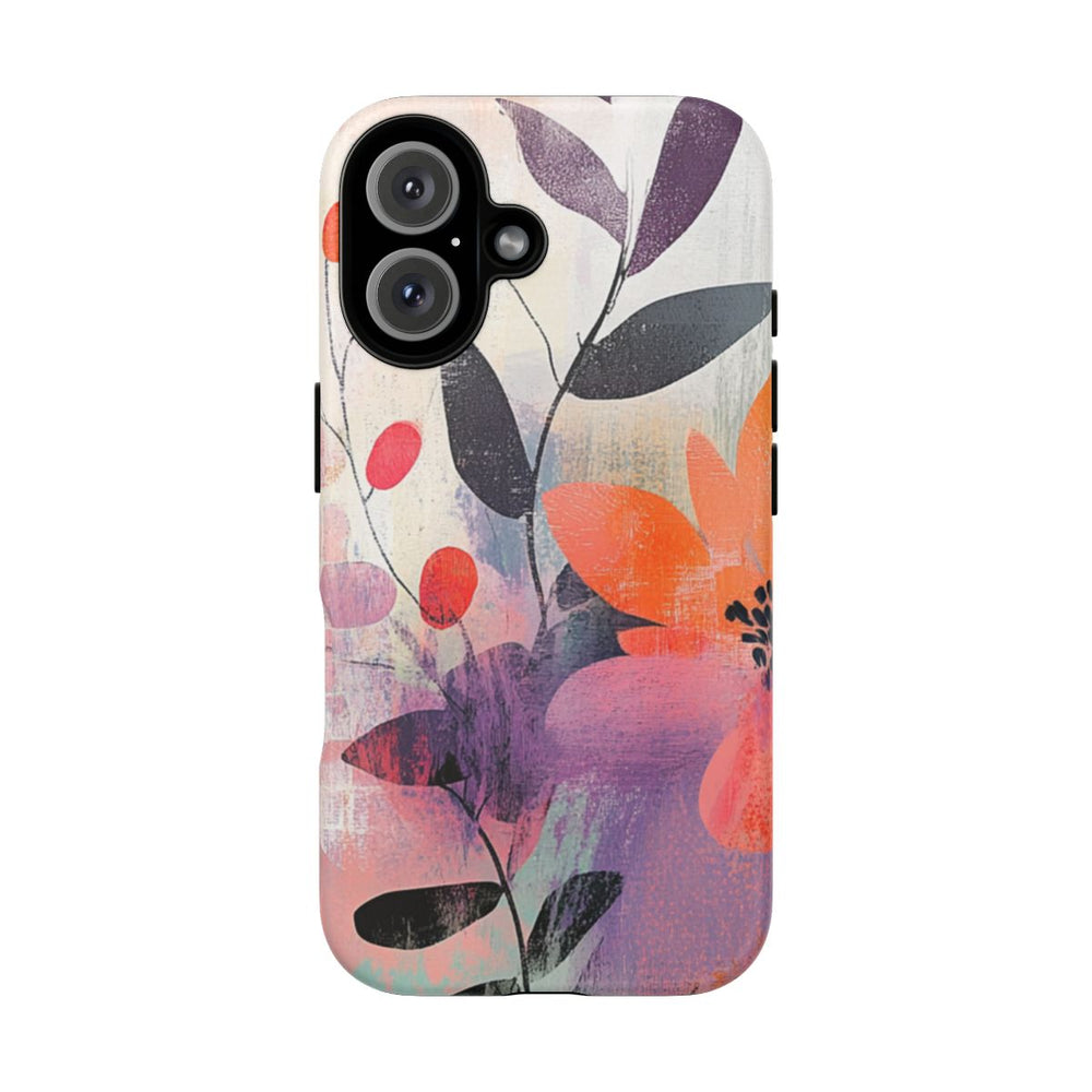 Dit hoesje is voorzien van een abstract ontwerp met organische bloemvormen, gelaagde texturen en zachte penseelstreken. De afbeelding combineert gedempte tinten roze, oranje, paars en subtiel groen voor een gemengde, artistieke uitstraling. Opvallende details zijn onder andere een grote oranje bloem met zwarte accenten, omringd door bladeren en kleine knoppen in diverse kleuren. De achtergrond bestaat uit een zachte mix van pasteltinten met een schilderachtige, expressieve stijl. Het hoesje is gemaakt van polycarbonaat en TPU voor extra stevigheid en is geschikt voor draadloos opladen.