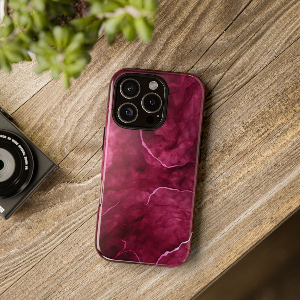 Dit hoesje heeft een abstracte marmerstructuur in diepe bourgondische tinten, met lichtere roze en witte aders die door het ontwerp lopen. Het patroon zorgt voor een vloeiende, organische uitstraling met een rijke, fluweelachtige look. Het hoesje is glanzend en extra stevig dankzij de dubbele laag van een polycarbonaat buitenkant en een TPU-binnenzijde, wat zorgt voor extra duurzaamheid en bescherming. Ondersteunt draadloos opladen en is bestand tegen weersinvloeden, waardoor de uitstraling langdurig mooi blijft.