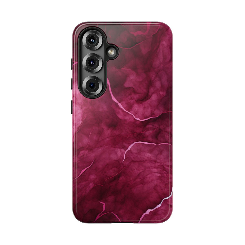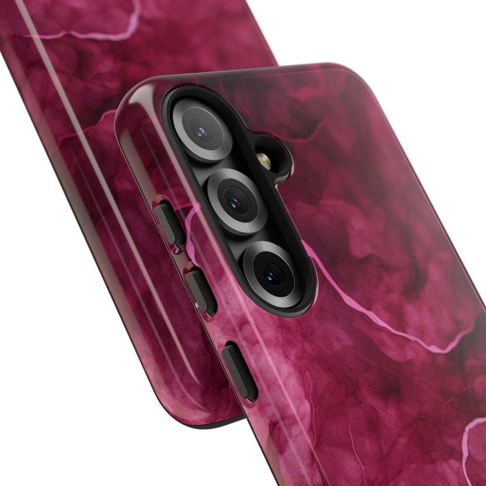 Dit hoesje heeft een abstracte marmerstructuur in diepe bourgondische tinten, met lichtere roze en witte aders die door het ontwerp lopen. Het patroon zorgt voor een vloeiende, organische uitstraling met een rijke, fluweelachtige look. Het hoesje is glanzend en extra stevig dankzij de dubbele laag van een polycarbonaat buitenkant en een TPU-binnenzijde, wat zorgt voor extra duurzaamheid en bescherming. Ondersteunt draadloos opladen en is bestand tegen weersinvloeden, waardoor de uitstraling langdurig mooi blijft.