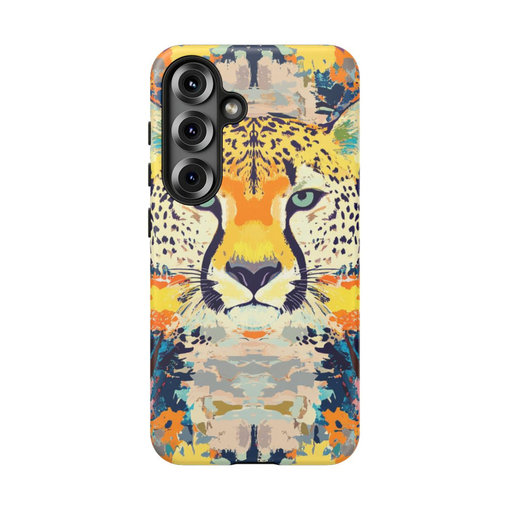 Dit telefoonhoesje heeft een gestileerd cheetagezicht in het midden, omringd door abstracte, kleurrijke verfspatten. Het patroon bestaat uit levendige kleuren zoals geel, oranje, blauw en paars, wat zorgt voor een dynamische en artistieke uitstraling. Het hoesje is mat afgewerkt en bestaat uit twee lagen van polycarbonaat en TPU, waardoor het extra stevig is en geschikt voor draadloos opladen.