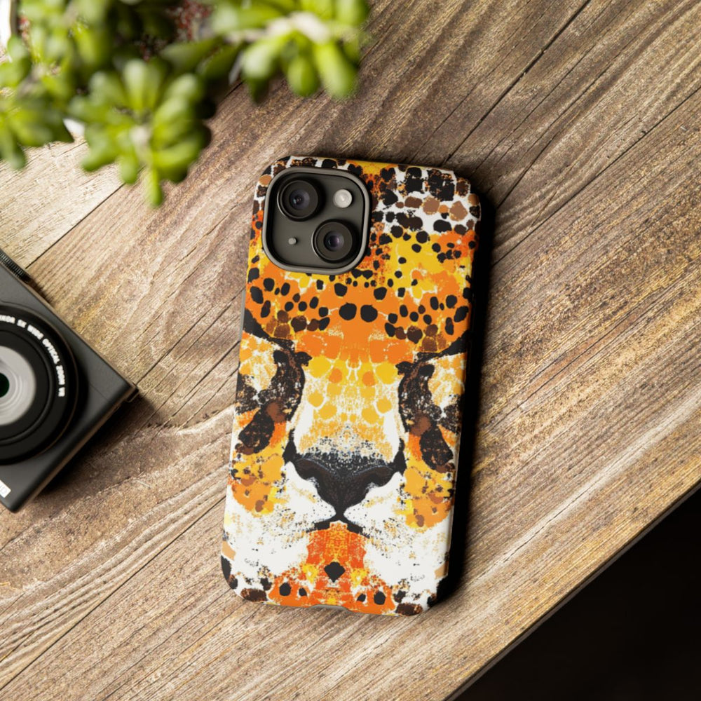 Dit hoesje heeft een abstracte, artistieke weergave van een cheetagezicht, opgebouwd uit een patroon van stippen in zwarte, bruine, oranje en gele tinten. Het ontwerp is zeer gedetailleerd en symmetrisch, wat zorgt voor een opvallende en moderne uitstraling. Het matte hoesje is extra stevig dankzij de dubbele laag van polycarbonaat en TPU. Hierdoor biedt het optimale bescherming en is het geschikt voor draadloos opladen.