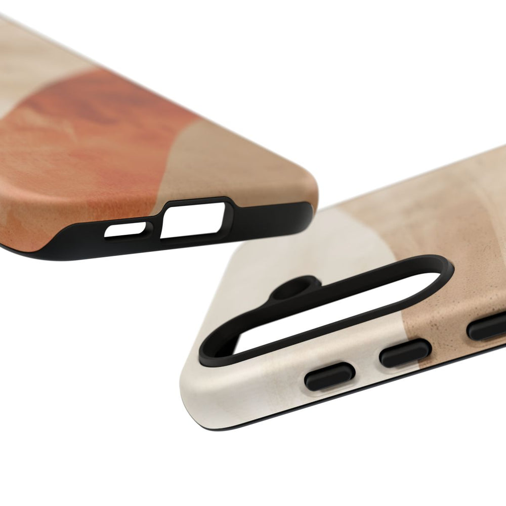 Dit hoesje heeft een ontwerp met abstracte, gebogen vormen in warme terracotta- en beigekleuren. De vormen hebben een natuurlijke, getextureerde uitstraling met een aquarelachtige penseelstreek, wat zorgt voor een organische en minimalistische compositie. De stijl is rustgevend en modern, met een subtiele wabi-sabi-invloed. Het hoesje bestaat uit twee lagen van polycarbonaat en TPU en biedt extra stevigheid en bescherming, terwijl draadloos opladen mogelijk blijft. Het ontwerp straalt een kalme en natuurlijke sfeer uit.