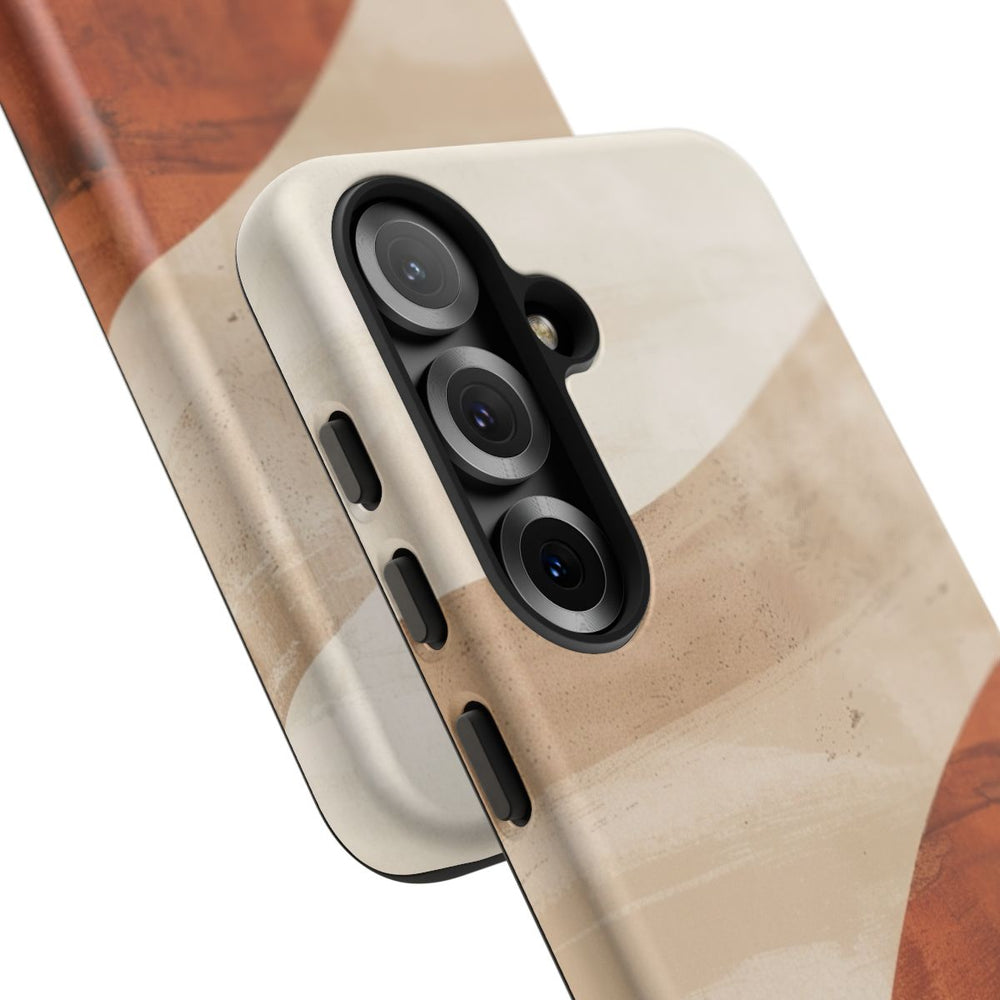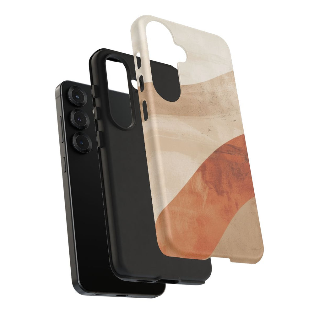 Dit hoesje heeft een ontwerp met abstracte, gebogen vormen in warme terracotta- en beigekleuren. De vormen hebben een natuurlijke, getextureerde uitstraling met een aquarelachtige penseelstreek, wat zorgt voor een organische en minimalistische compositie. De stijl is rustgevend en modern, met een subtiele wabi-sabi-invloed. Het hoesje bestaat uit twee lagen van polycarbonaat en TPU en biedt extra stevigheid en bescherming, terwijl draadloos opladen mogelijk blijft. Het ontwerp straalt een kalme en natuurlijke sfeer uit.