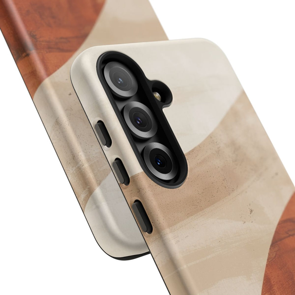 Dit hoesje heeft een ontwerp met abstracte, gebogen vormen in warme terracotta- en beigekleuren. De vormen hebben een natuurlijke, getextureerde uitstraling met een aquarelachtige penseelstreek, wat zorgt voor een organische en minimalistische compositie. De stijl is rustgevend en modern, met een subtiele wabi-sabi-invloed. Het hoesje bestaat uit twee lagen van polycarbonaat en TPU en biedt extra stevigheid en bescherming, terwijl draadloos opladen mogelijk blijft. Het ontwerp straalt een kalme en natuurlijke sfeer uit.