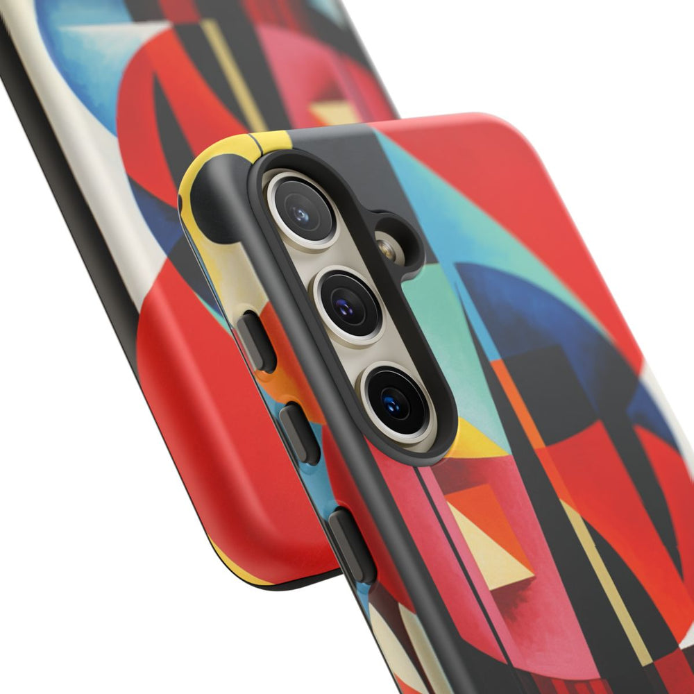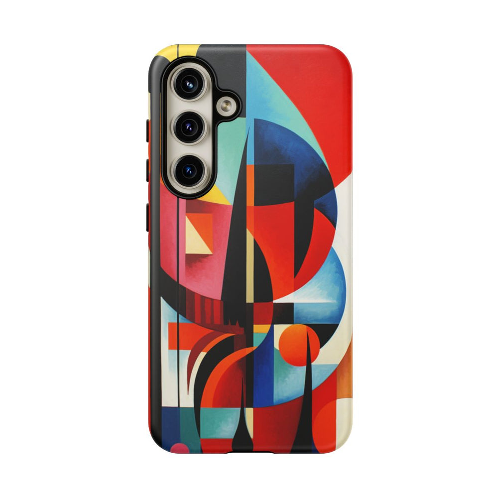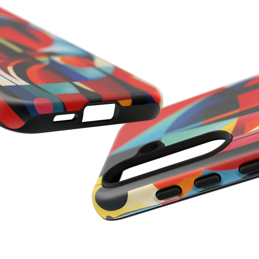 Dit ontwerp heeft een abstracte geometrische samenstelling met overlappende vormen zoals cirkels, rechthoeken en gebogen lijnen. Het kunstwerk maakt gebruik van een rijk kleurenpalet met onder andere rood, oranje, geel, blauw, zwart en wit, wat zorgt voor een dynamisch en levendig visueel effect. De vormen zijn gerangschikt met scherpe hoeken en vloeiende lijnen, waarbij warme en koele tinten mooi samenkomen. De print is aangebracht op een mat telefoonhoesje van polycarbonaat en TPU, dat bestaat uit twee lagen voor extra bescherming en geschikt is voor draadloos opladen.