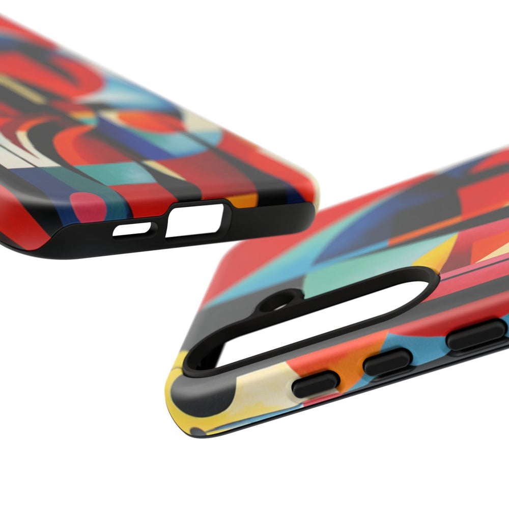 Dit ontwerp heeft een abstracte geometrische samenstelling met overlappende vormen zoals cirkels, rechthoeken en gebogen lijnen. Het kunstwerk maakt gebruik van een rijk kleurenpalet met onder andere rood, oranje, geel, blauw, zwart en wit, wat zorgt voor een dynamisch en levendig visueel effect. De vormen zijn gerangschikt met scherpe hoeken en vloeiende lijnen, waarbij warme en koele tinten mooi samenkomen. De print is aangebracht op een mat telefoonhoesje van polycarbonaat en TPU, dat bestaat uit twee lagen voor extra bescherming en geschikt is voor draadloos opladen.