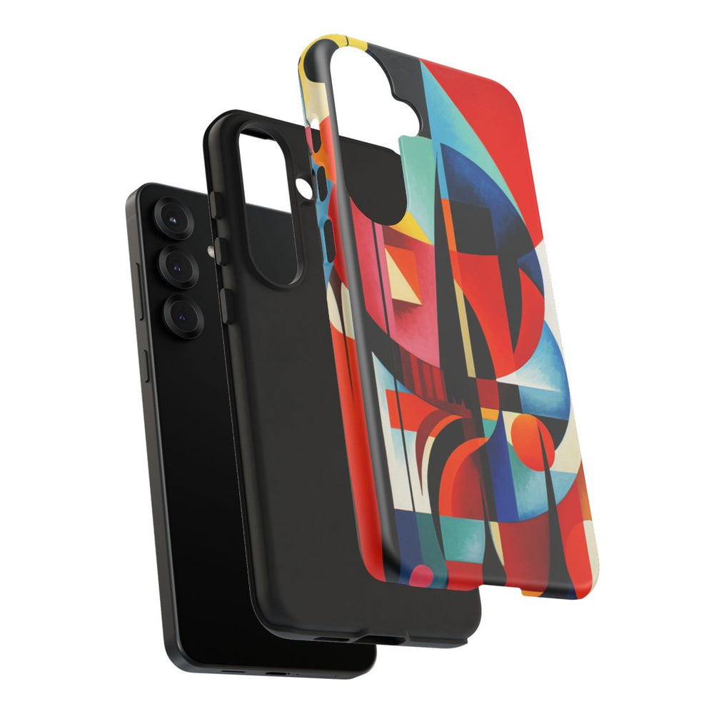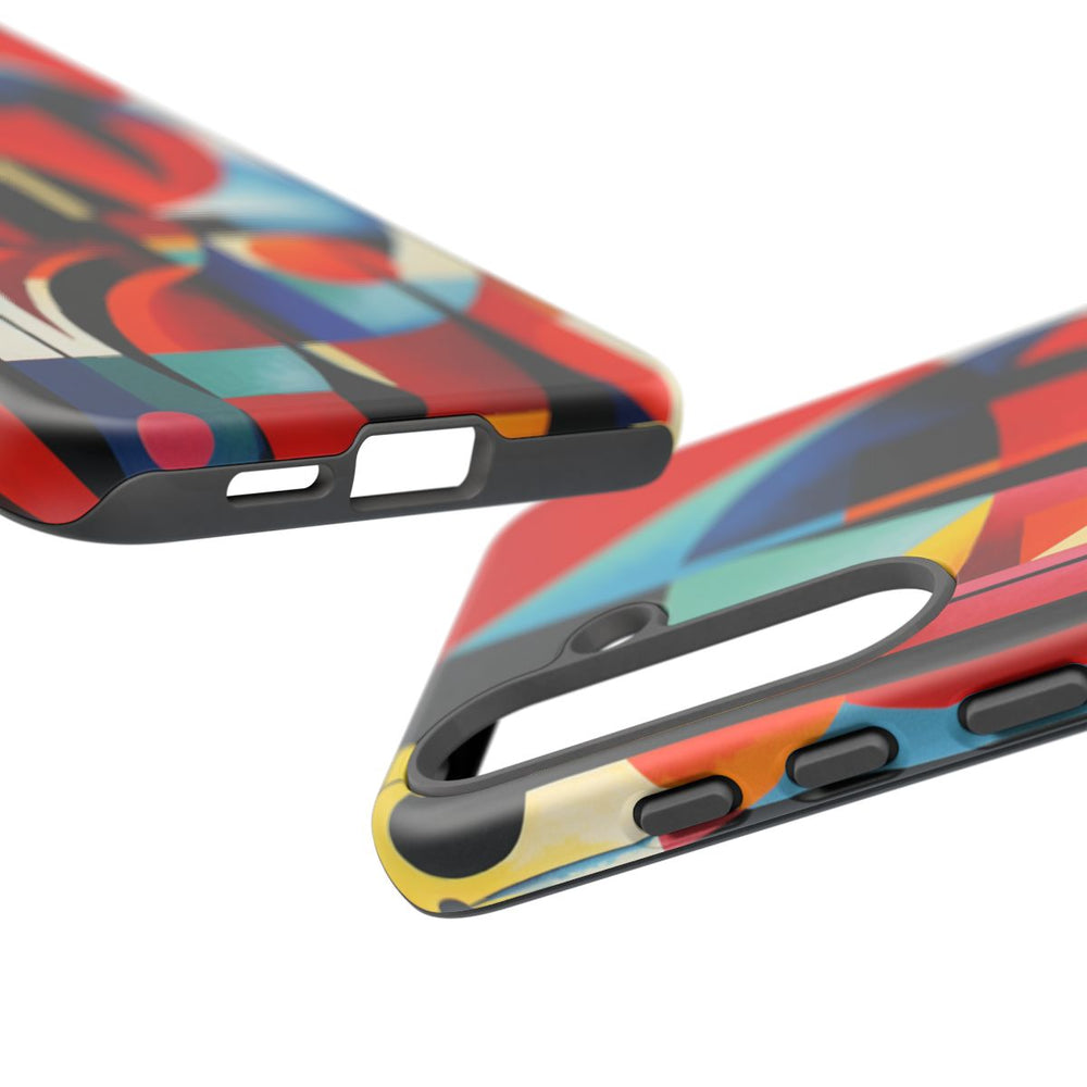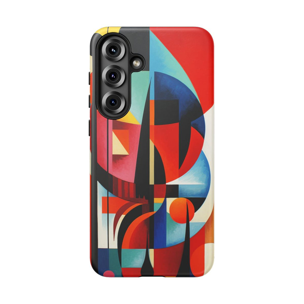 Dit ontwerp heeft een abstracte geometrische samenstelling met overlappende vormen zoals cirkels, rechthoeken en gebogen lijnen. Het kunstwerk maakt gebruik van een rijk kleurenpalet met onder andere rood, oranje, geel, blauw, zwart en wit, wat zorgt voor een dynamisch en levendig visueel effect. De vormen zijn gerangschikt met scherpe hoeken en vloeiende lijnen, waarbij warme en koele tinten mooi samenkomen. De print is aangebracht op een mat telefoonhoesje van polycarbonaat en TPU, dat bestaat uit twee lagen voor extra bescherming en geschikt is voor draadloos opladen.