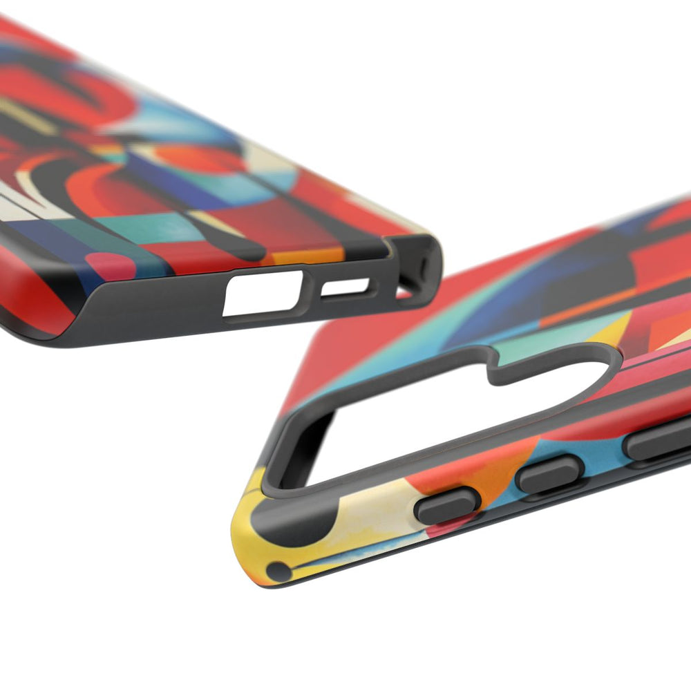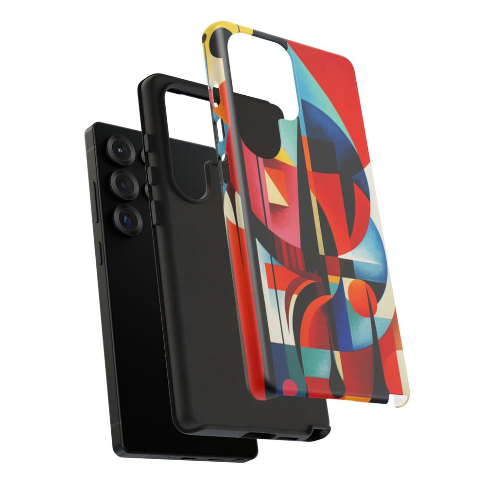 Dit ontwerp heeft een abstracte geometrische samenstelling met overlappende vormen zoals cirkels, rechthoeken en gebogen lijnen. Het kunstwerk maakt gebruik van een rijk kleurenpalet met onder andere rood, oranje, geel, blauw, zwart en wit, wat zorgt voor een dynamisch en levendig visueel effect. De vormen zijn gerangschikt met scherpe hoeken en vloeiende lijnen, waarbij warme en koele tinten mooi samenkomen. De print is aangebracht op een mat telefoonhoesje van polycarbonaat en TPU, dat bestaat uit twee lagen voor extra bescherming en geschikt is voor draadloos opladen.