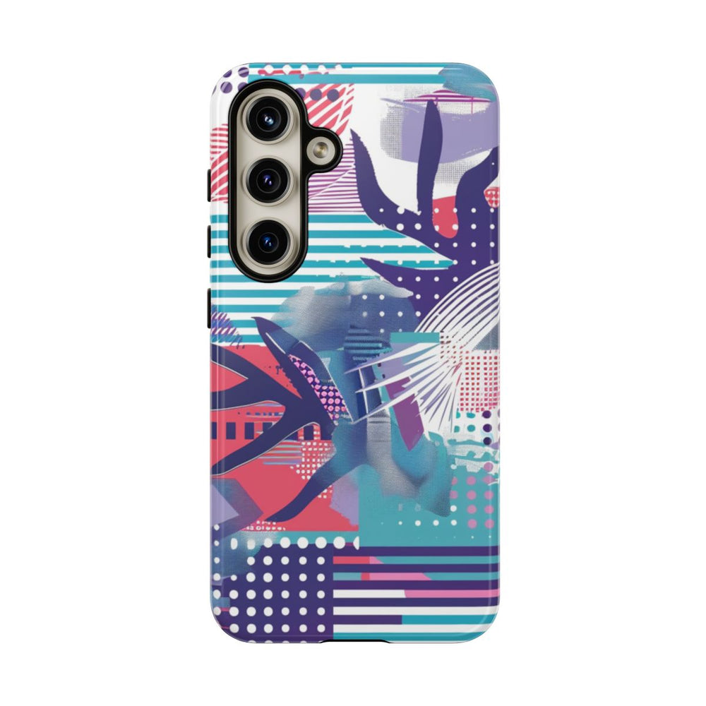 Dit hoesje heeft een abstract ontwerp met een speelse combinatie van geometrische en organische vormen in een levendig kleurenpalet. Strepen, stippen, rasters en bladvormen zijn dynamisch over het oppervlak verdeeld. De kleuren variëren van paars, blauw, teal en rood tot accenten van geel, wat zorgt voor een moderne en opvallende uitstraling. Het hoesje is voorzien van een glanzende afwerking, een stevige buitenkant van polycarbonaat en een TPU-binnenlaag voor optimale bescherming. Ondersteunt draadloos opladen.