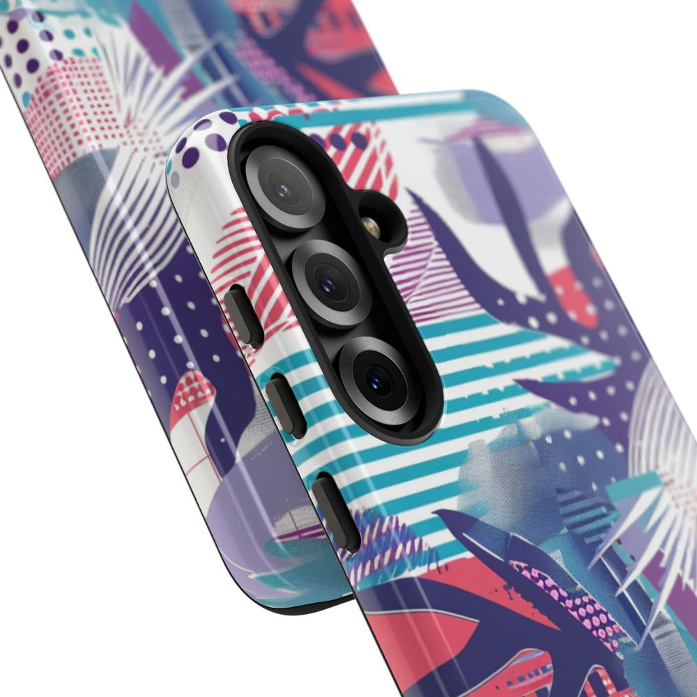 Dit hoesje heeft een abstract ontwerp met een speelse combinatie van geometrische en organische vormen in een levendig kleurenpalet. Strepen, stippen, rasters en bladvormen zijn dynamisch over het oppervlak verdeeld. De kleuren variëren van paars, blauw, teal en rood tot accenten van geel, wat zorgt voor een moderne en opvallende uitstraling. Het hoesje is voorzien van een glanzende afwerking, een stevige buitenkant van polycarbonaat en een TPU-binnenlaag voor optimale bescherming. Ondersteunt draadloos opladen.