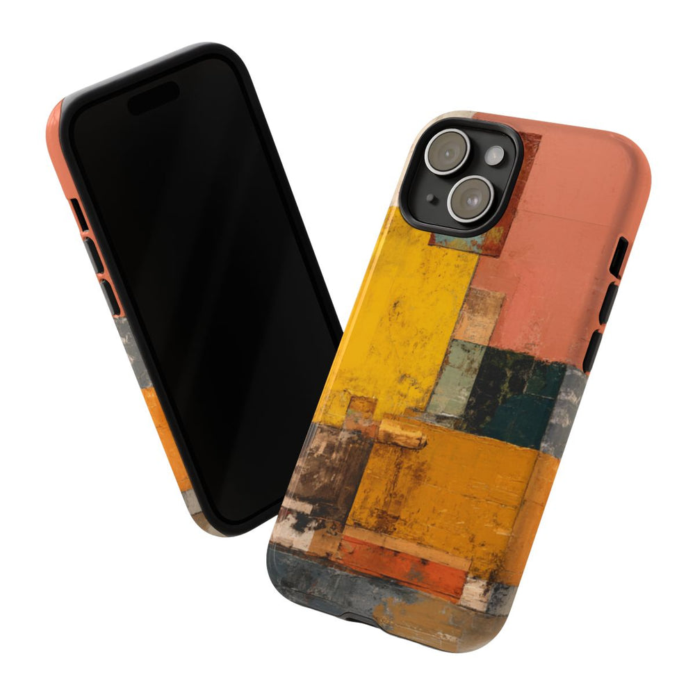 Dit hoesje heeft een abstract ontwerp met geometrische blokken in verschillende kleuren, zoals geel, oranje, koraal, groen, grijs en bruin. De textuur doet denken aan een geschilderd oppervlak met zichtbare penseelstreken en een licht verweerde uitstraling. De combinatie van rechthoeken en vierkanten zorgt voor een evenwichtige, moderne uitstraling. Het hoesje bestaat uit twee lagen van polycarbonaat en TPU, wat zorgt voor extra stevigheid en bescherming. Geschikt voor draadloos opladen.