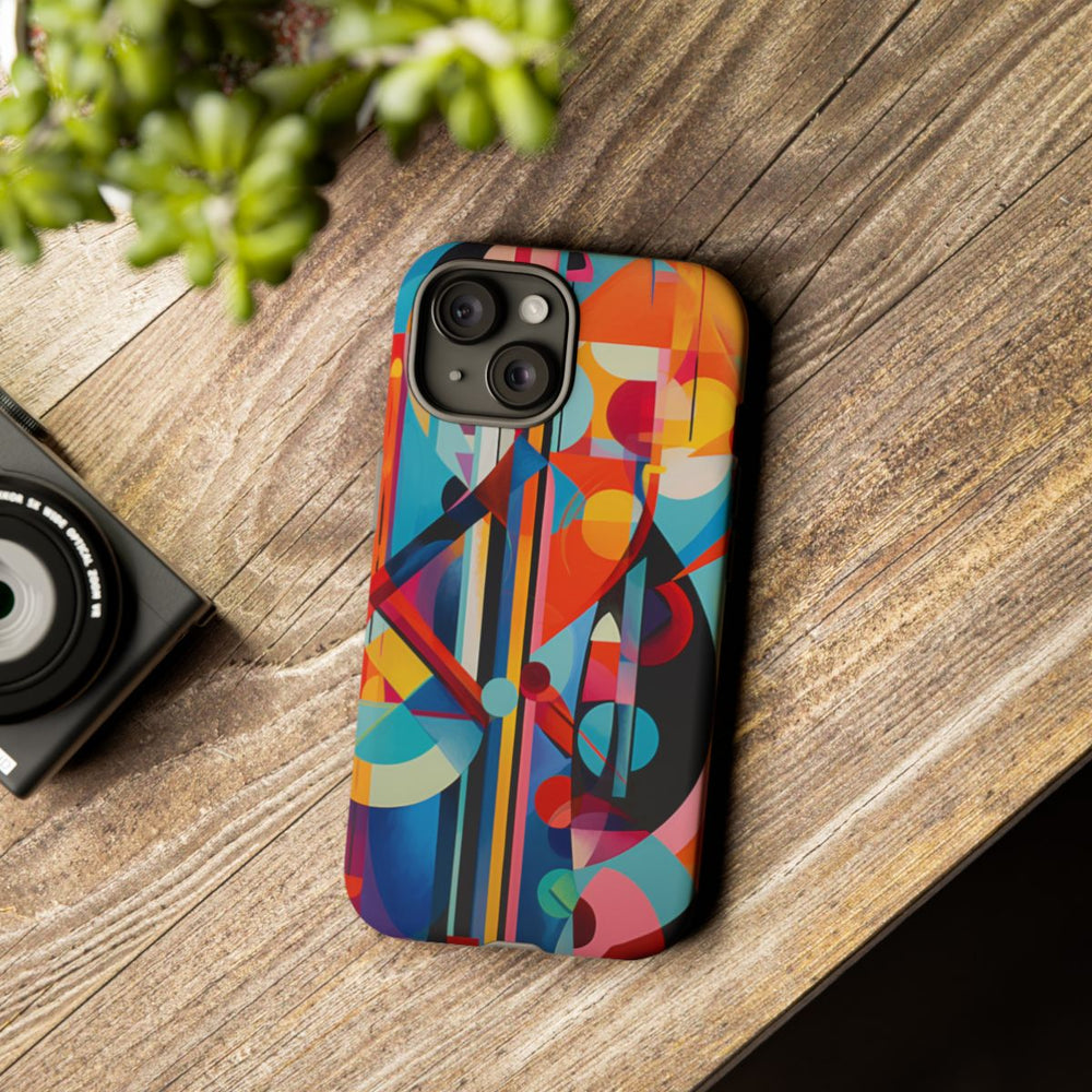 Dit telefoonhoesje heeft een abstract geometrisch ontwerp met diverse vormen zoals cirkels, driehoeken en rechthoeken. Het kunstwerk bestaat uit een rijk palet van heldere en diepe kleuren, waaronder rood, oranje, blauw, roze, geel en zwart. De vormen overlappen en kruisen elkaar, wat zorgt voor een dynamisch en gelaagd effect. Het hoesje is opgebouwd uit twee lagen van polycarbonaat en TPU voor extra stevigheid en bescherming, en is geschikt voor draadloos opladen.