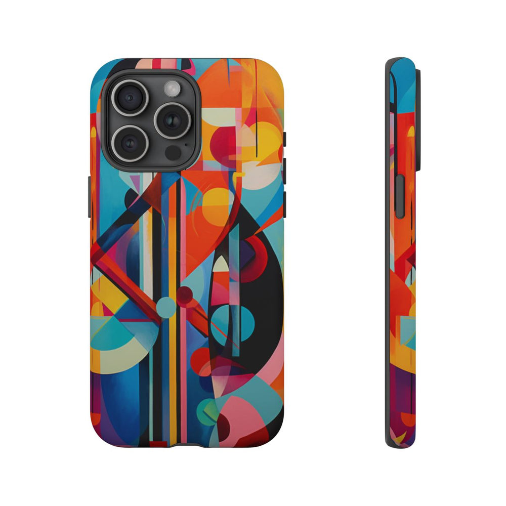 Dit telefoonhoesje heeft een abstract geometrisch ontwerp met diverse vormen zoals cirkels, driehoeken en rechthoeken. Het kunstwerk bestaat uit een rijk palet van heldere en diepe kleuren, waaronder rood, oranje, blauw, roze, geel en zwart. De vormen overlappen en kruisen elkaar, wat zorgt voor een dynamisch en gelaagd effect. Het hoesje is opgebouwd uit twee lagen van polycarbonaat en TPU voor extra stevigheid en bescherming, en is geschikt voor draadloos opladen.