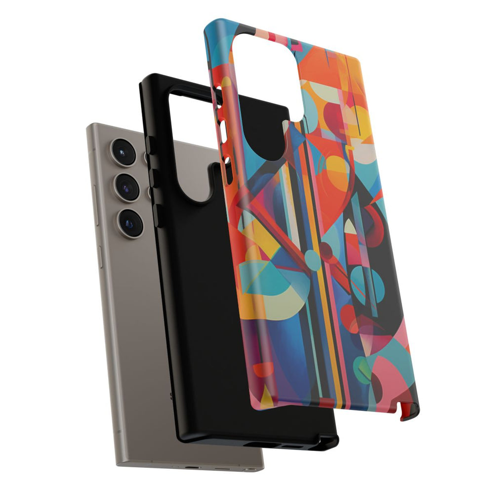 Dit telefoonhoesje heeft een abstract geometrisch ontwerp met diverse vormen zoals cirkels, driehoeken en rechthoeken. Het kunstwerk bestaat uit een rijk palet van heldere en diepe kleuren, waaronder rood, oranje, blauw, roze, geel en zwart. De vormen overlappen en kruisen elkaar, wat zorgt voor een dynamisch en gelaagd effect. Het hoesje is opgebouwd uit twee lagen van polycarbonaat en TPU voor extra stevigheid en bescherming, en is geschikt voor draadloos opladen.