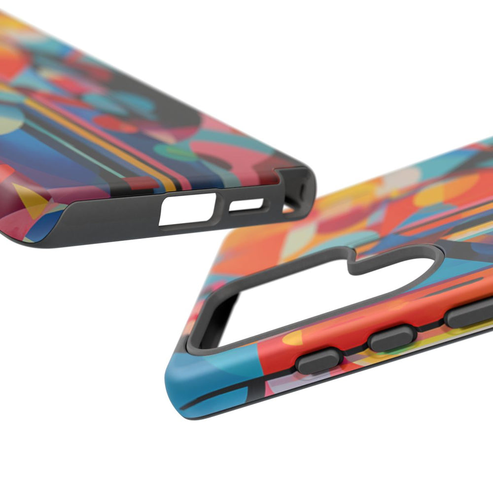 Dit telefoonhoesje heeft een abstract geometrisch ontwerp met diverse vormen zoals cirkels, driehoeken en rechthoeken. Het kunstwerk bestaat uit een rijk palet van heldere en diepe kleuren, waaronder rood, oranje, blauw, roze, geel en zwart. De vormen overlappen en kruisen elkaar, wat zorgt voor een dynamisch en gelaagd effect. Het hoesje is opgebouwd uit twee lagen van polycarbonaat en TPU voor extra stevigheid en bescherming, en is geschikt voor draadloos opladen.