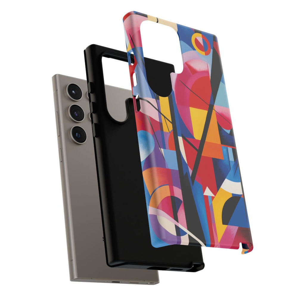 Dit hoesje is voorzien van een abstracte geometrische compositie met diverse vormen zoals cirkels, driehoeken en rechthoeken. Het ontwerp maakt gebruik van een levendig kleurenpalet met vooral blauw, rood, geel, roze en zwart. Scherpe zwarte lijnen kruisen de vormen en zorgen voor een krachtig contrast en een gestructureerde uitstraling. De achtergrond en vormen lopen vloeiend in elkaar over door het gebruik van kleurverlopen en effen tinten, wat zorgt voor een moderne en opvallende uitstraling. Het ontwerp is gedrukt op een matte, stevige hoes met dubbele laag van polycarbonaat en TPU, die optimale bescherming biedt en geschikt is voor draadloos opladen.