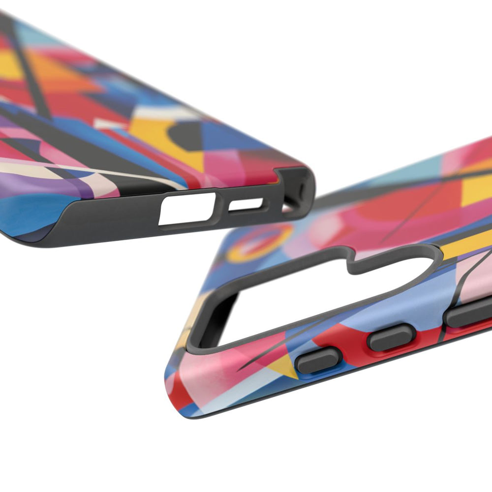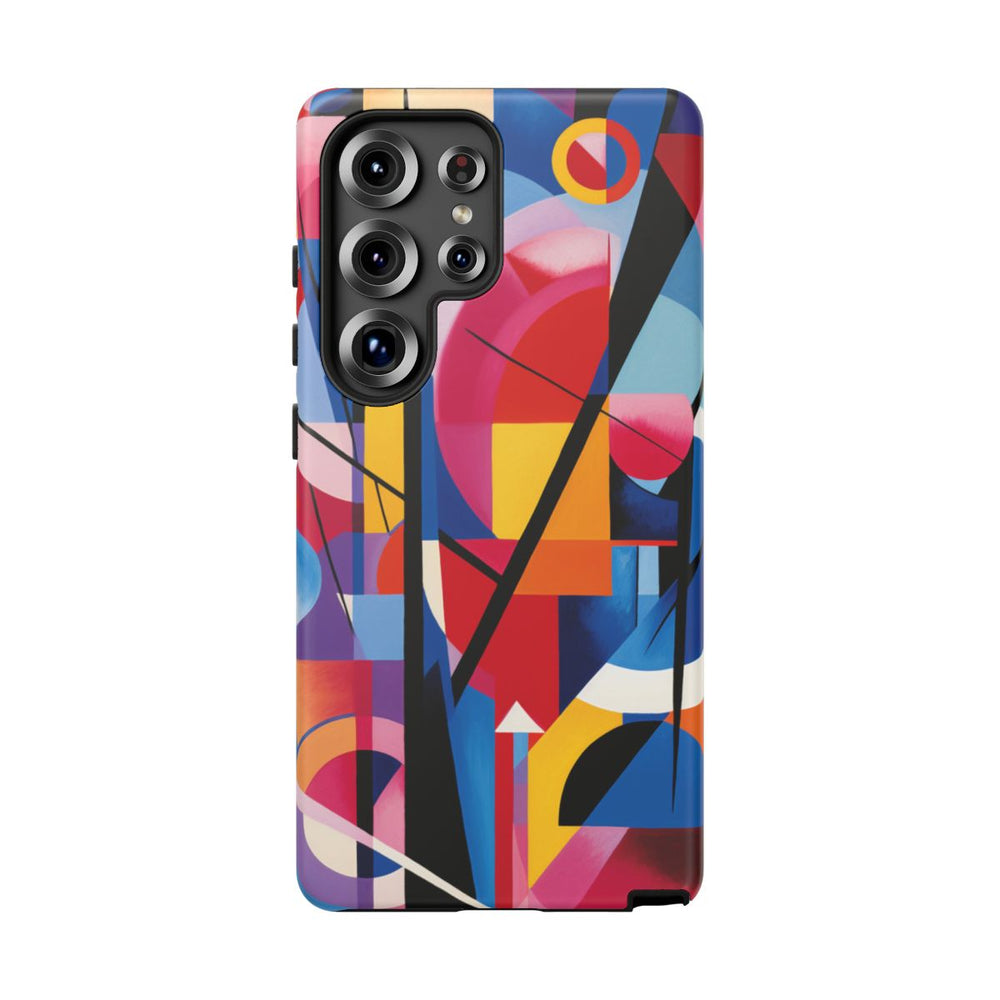 Dit hoesje is voorzien van een abstracte geometrische compositie met diverse vormen zoals cirkels, driehoeken en rechthoeken. Het ontwerp maakt gebruik van een levendig kleurenpalet met vooral blauw, rood, geel, roze en zwart. Scherpe zwarte lijnen kruisen de vormen en zorgen voor een krachtig contrast en een gestructureerde uitstraling. De achtergrond en vormen lopen vloeiend in elkaar over door het gebruik van kleurverlopen en effen tinten, wat zorgt voor een moderne en opvallende uitstraling. Het ontwerp is gedrukt op een matte, stevige hoes met dubbele laag van polycarbonaat en TPU, die optimale bescherming biedt en geschikt is voor draadloos opladen.