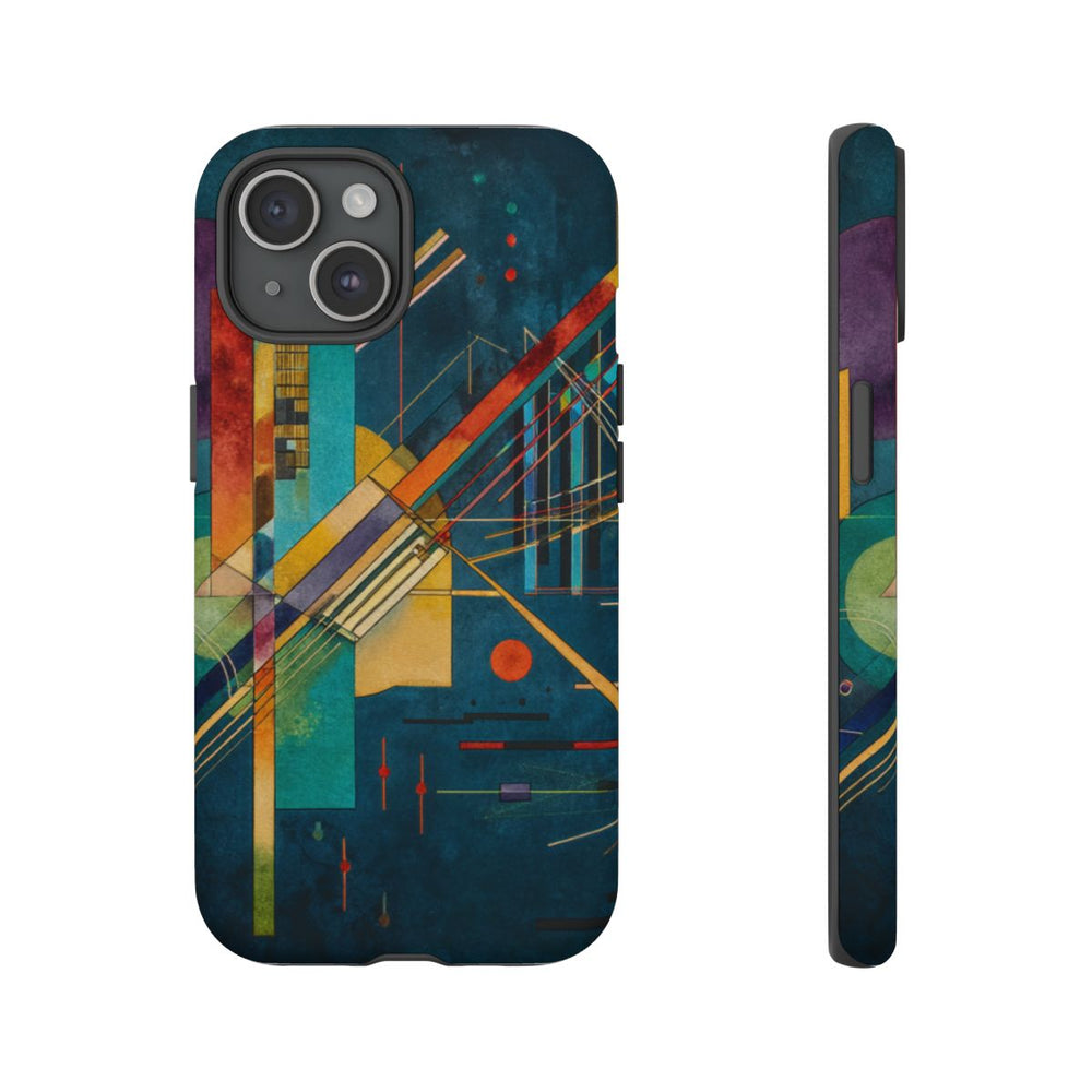 Dit hoesje heeft een abstracte geometrische compositie op een donkerblauwe, getextureerde achtergrond. Het ontwerp bevat diverse vormen zoals cirkels, rechthoeken en lijnen in kleuren als turquoise, geel, oranje, paars, rood en groen. De gelaagde elementen en kruisingen van lijnen en vormen zorgen voor diepte en dynamiek. Het matte hoesje is gemaakt van polycarbonaat en TPU voor extra stevigheid en ondersteunt draadloos opladen.