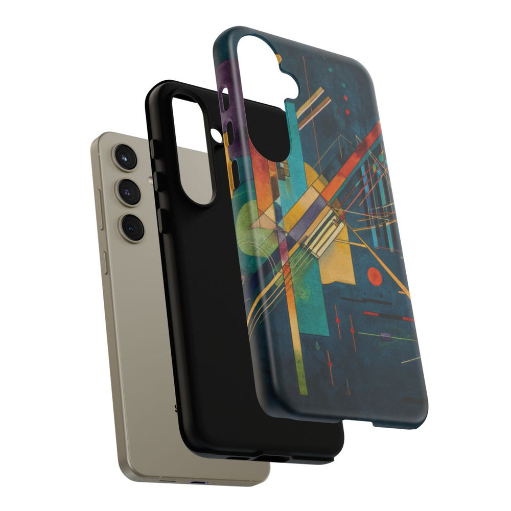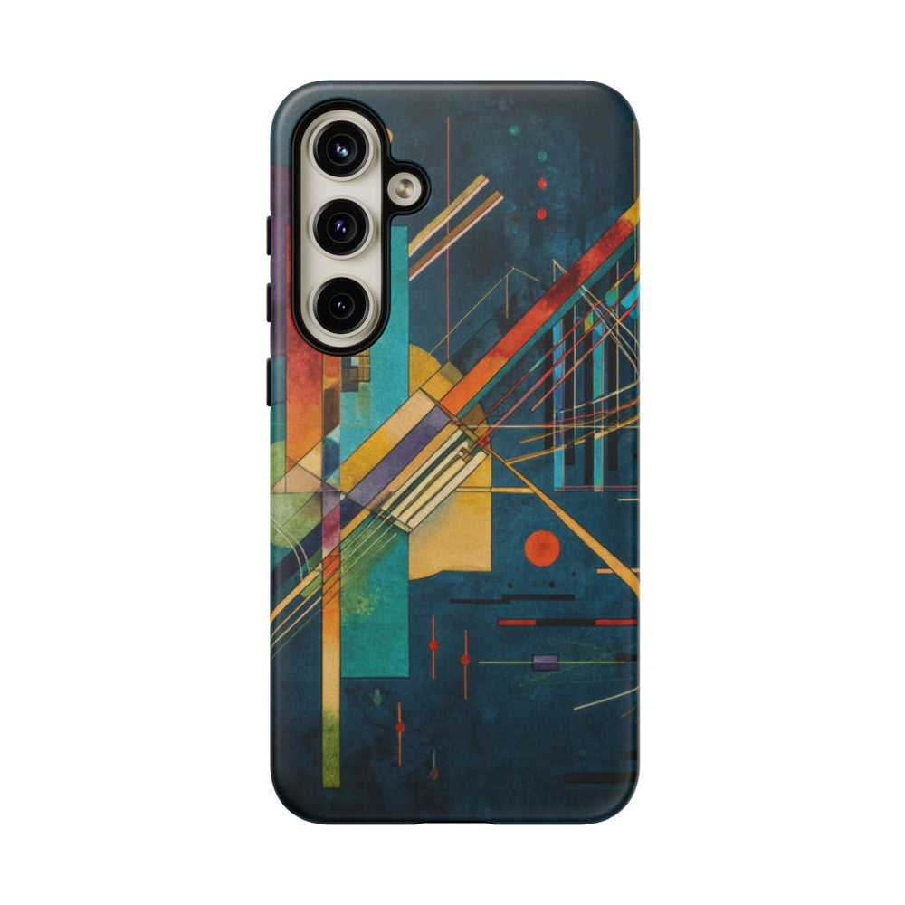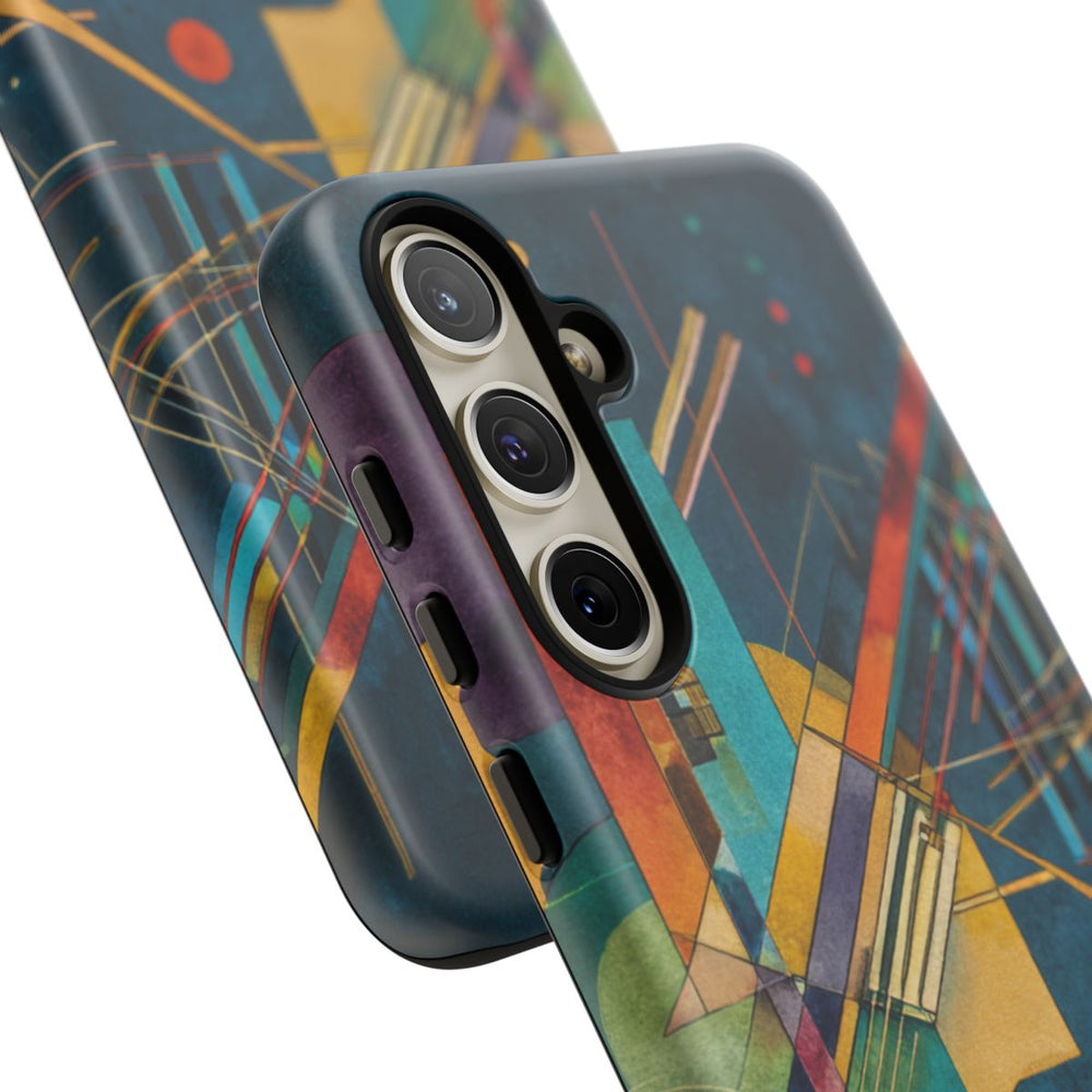 Dit hoesje is voorzien van een abstracte geometrische compositie met diverse vormen, zoals cirkels, rechthoeken en lijnen die speels zijn gerangschikt. De achtergrond heeft een diepe blauwe kleur met gelaagde texturen. Turquoise, geel, oranje, paars, rood en groen zorgen samen voor een levendig kleurcontrast. Het hoesje bestaat uit twee lagen van polycarbonaat en TPU, heeft een matte afwerking, ondersteunt draadloos opladen en biedt bescherming tegen verschillende weersomstandigheden.