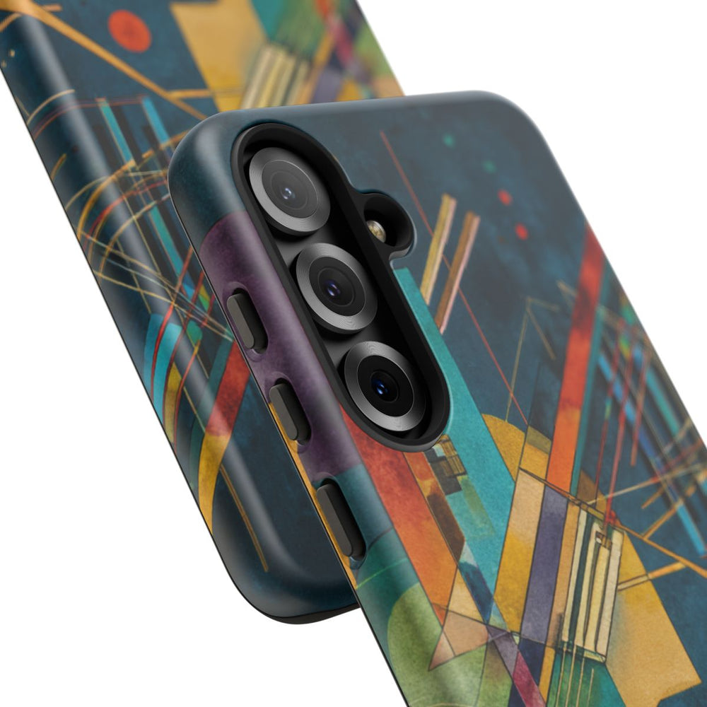 Dit hoesje heeft een abstract geometrisch ontwerp op een donkerblauwe, getextureerde achtergrond. Het patroon bestaat uit verschillende vormen zoals cirkels, rechthoeken en lijnen in kleuren als turquoise, geel, oranje, paars, groen en rood. Door het gebruik van overlappende elementen en fijne lijnen ontstaat er een gevoel van diepte en beweging. Het hoesje is voorzien van een dubbele laag met een polycarbonaat buitenkant en een TPU-binnenzijde, en ondersteunt draadloos opladen.