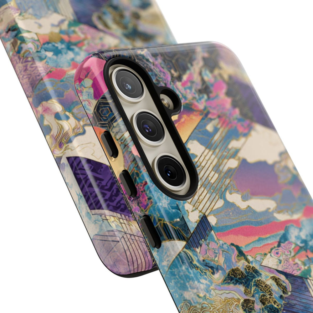 Dit hoesje toont een abstract landschap waarin geometrische vormen en natuurlijke én architectonische elementen samenkomen. Op de voorgrond staan roze bomen met verfijnde takken, terwijl verschillende geometrische vormen en kubussen met gedetailleerde lijnpatronen zorgen voor een gelaagd effect. De achtergrond bestaat uit een zon met kleurverloop en wolkachtige vormen in zachte pasteltinten zoals blauw, paars en roze. Gouden accenten geven het ontwerp een subtiel metallic effect. De afbeelding is gedrukt op een glanzend, stevig telefoonhoesje met dubbele laag voor extra bescherming en ondersteuning voor draadloos opladen.