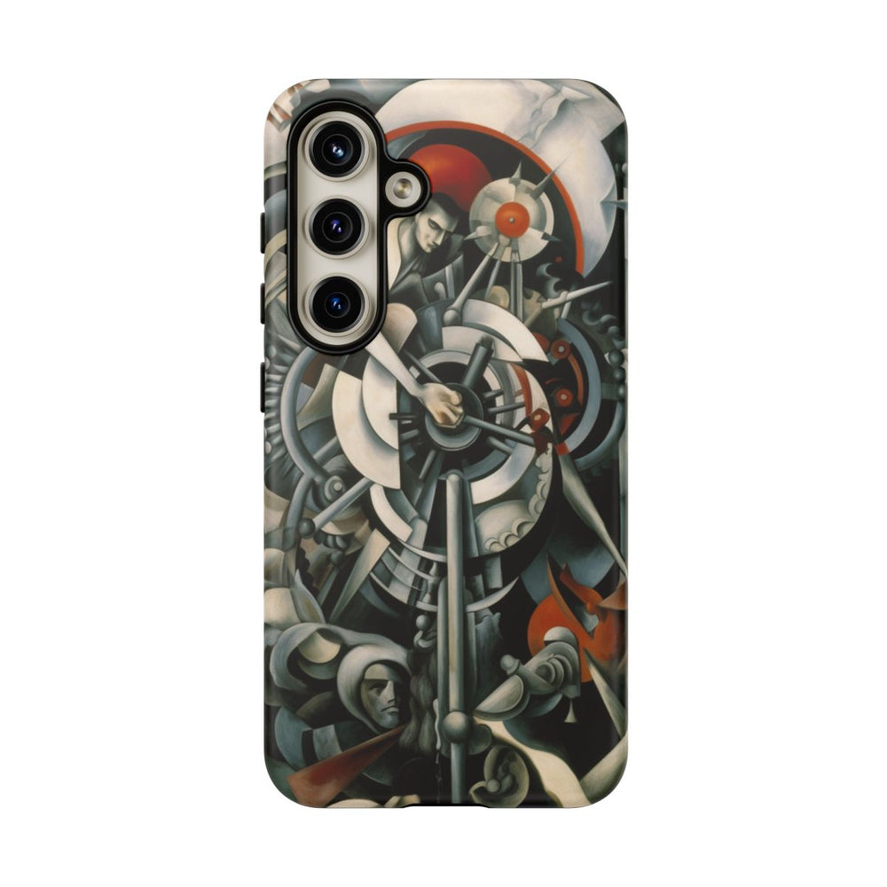 Dit hoesje is voorzien van een abstracte geometrische afbeelding, waarbij een centrale figuur te zien is die in contact staat met complexe machines. Het ontwerp combineert scherpe lijnen en ronde vormen in voornamelijk grijs-, zwart- en wittinten, aangevuld met diep rood-oranje accenten. De illustratie straalt een dynamische, mechanische sfeer uit in een kubistische en futuristische stijl. Het hoesje bestaat uit twee lagen: een stevige polycarbonaat buitenkant met een matte afwerking en een TPU-binnenlaag. Ondersteunt draadloos opladen.
