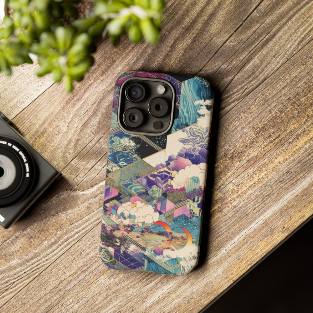 Dit hoesje heeft een verfijnd abstract geometrisch ontwerp met gelaagde isometrische vormen. Het ontwerp bevat levendige paarse en roze bomen, blauwe kristalachtige structuren en gestileerde wolken. Natuurlijke elementen zoals bomen en wolken worden gecombineerd met strakke geometrische lijnen en patronen, wat zorgt voor een gedetailleerd en surrealistisch landschap. Het hoesje bestaat uit twee lagen: een matte buitenkant van polycarbonaat en een binnenzijde van TPU. Hierdoor is het extra stevig en geschikt voor draadloos opladen.