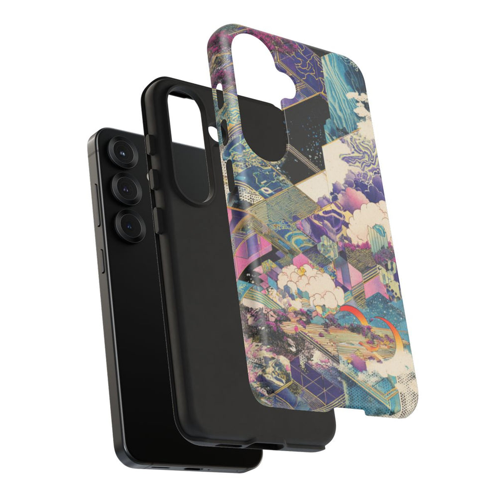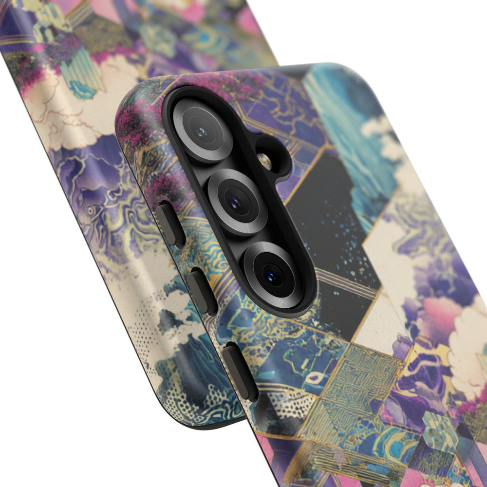 Dit hoesje heeft een verfijnd abstract geometrisch ontwerp met gelaagde isometrische vormen. Het ontwerp bevat levendige paarse en roze bomen, blauwe kristalachtige structuren en gestileerde wolken. Natuurlijke elementen zoals bomen en wolken worden gecombineerd met strakke geometrische lijnen en patronen, wat zorgt voor een gedetailleerd en surrealistisch landschap. Het hoesje bestaat uit twee lagen: een matte buitenkant van polycarbonaat en een binnenzijde van TPU. Hierdoor is het extra stevig en geschikt voor draadloos opladen.