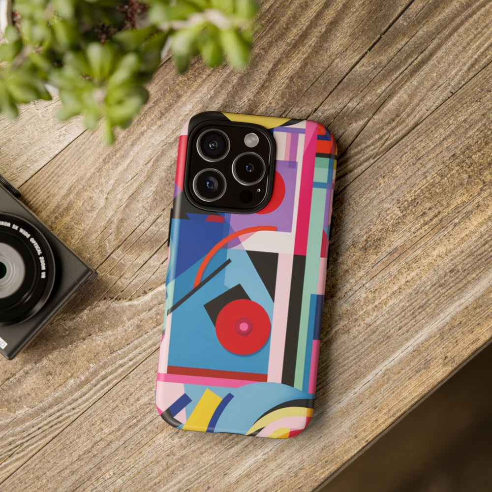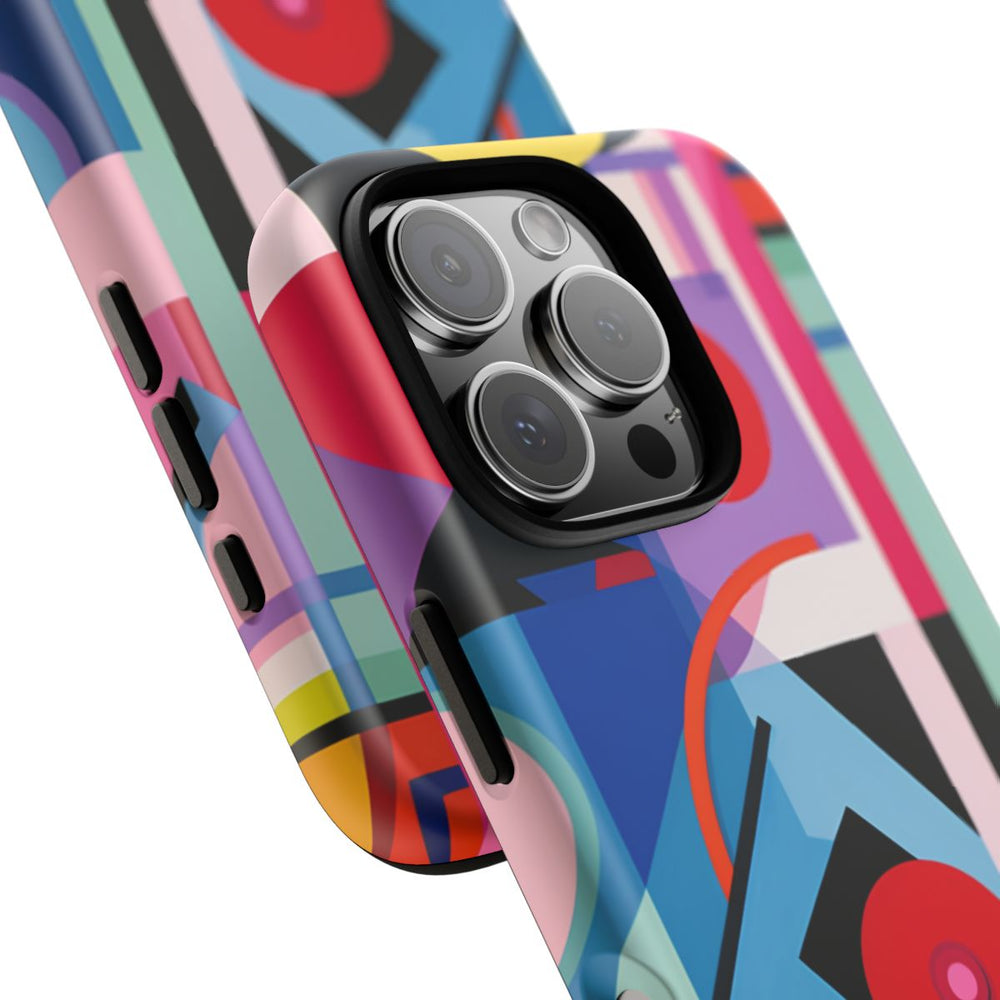 Dit hoesje heeft een abstract ontwerp met geometrische vormen zoals cirkels, driehoeken en rechthoeken. De illustratie gebruikt een levendig kleurenpalet met vooral blauw, roze, rood, geel en zwart. De overlappende en kruisende vormen zorgen voor een dynamisch en modern effect. Het hoesje bestaat uit twee lagen met een matte afwerking, een polycarbonaat buitenkant en een TPU-binnenzijde. Het is stevig, bestand tegen gebruik buitenshuis en geschikt voor draadloos opladen.
