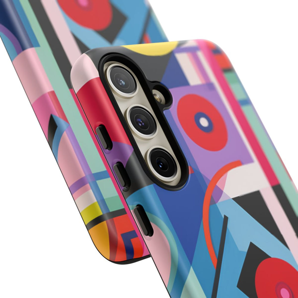 Dit hoesje heeft een abstract ontwerp met geometrische vormen zoals cirkels, driehoeken en rechthoeken. De illustratie gebruikt een levendig kleurenpalet met vooral blauw, roze, rood, geel en zwart. De overlappende en kruisende vormen zorgen voor een dynamisch en modern effect. Het hoesje bestaat uit twee lagen met een matte afwerking, een polycarbonaat buitenkant en een TPU-binnenzijde. Het is stevig, bestand tegen gebruik buitenshuis en geschikt voor draadloos opladen.