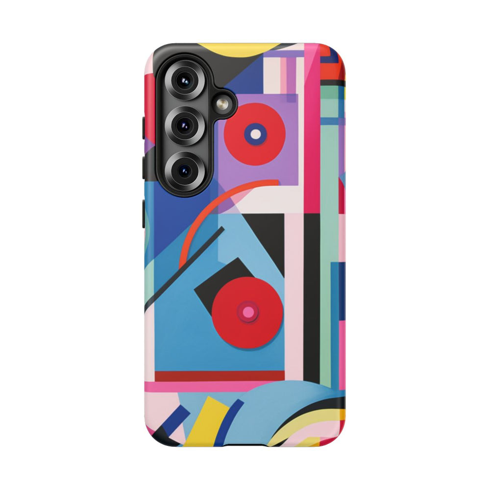 Dit hoesje heeft een abstract ontwerp met geometrische vormen zoals cirkels, driehoeken en rechthoeken. De illustratie gebruikt een levendig kleurenpalet met vooral blauw, roze, rood, geel en zwart. De overlappende en kruisende vormen zorgen voor een dynamisch en modern effect. Het hoesje bestaat uit twee lagen met een matte afwerking, een polycarbonaat buitenkant en een TPU-binnenzijde. Het is stevig, bestand tegen gebruik buitenshuis en geschikt voor draadloos opladen.