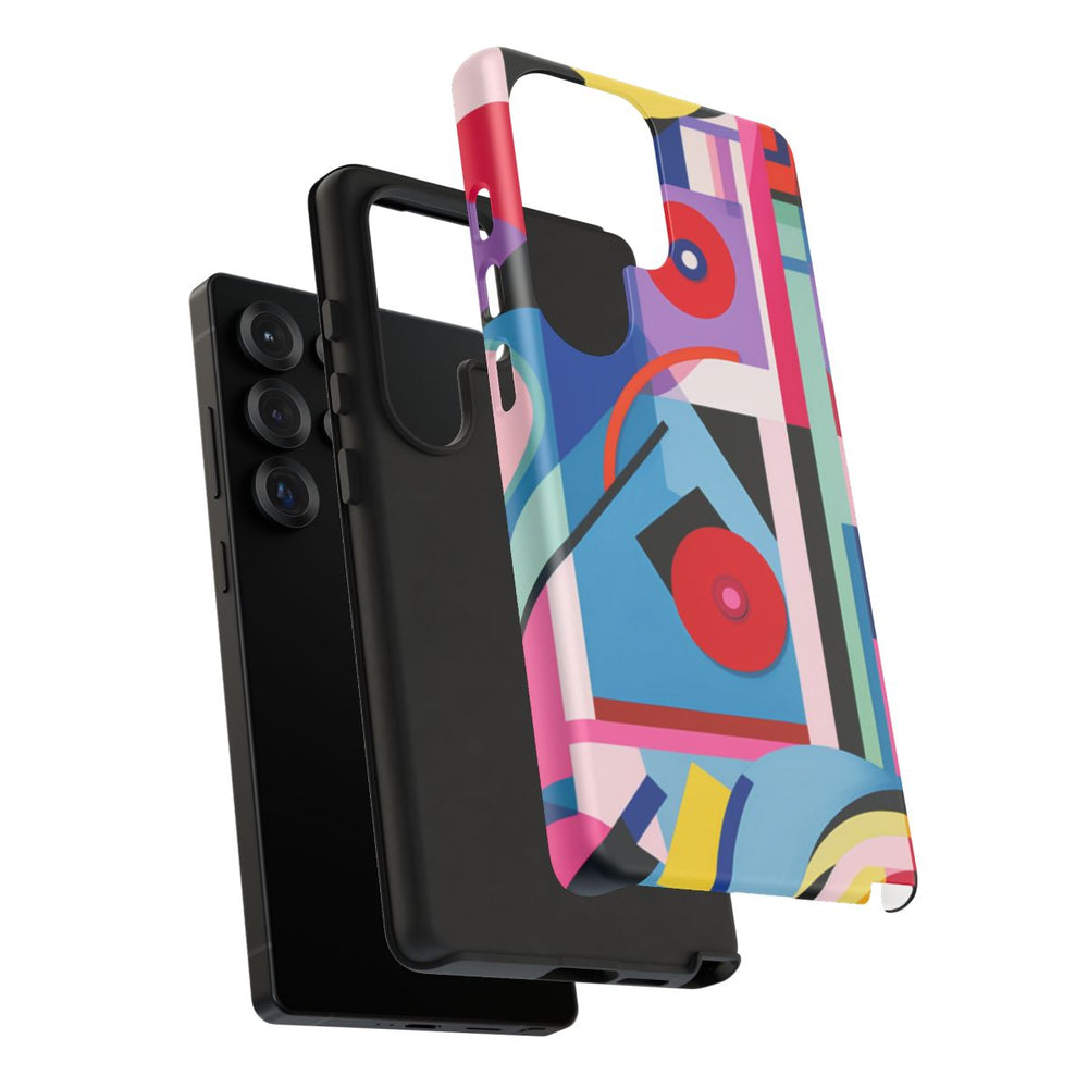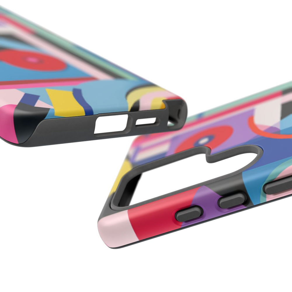 Dit hoesje heeft een abstract ontwerp met geometrische vormen zoals cirkels, driehoeken en rechthoeken. De illustratie gebruikt een levendig kleurenpalet met vooral blauw, roze, rood, geel en zwart. De overlappende en kruisende vormen zorgen voor een dynamisch en modern effect. Het hoesje bestaat uit twee lagen met een matte afwerking, een polycarbonaat buitenkant en een TPU-binnenzijde. Het is stevig, bestand tegen gebruik buitenshuis en geschikt voor draadloos opladen.