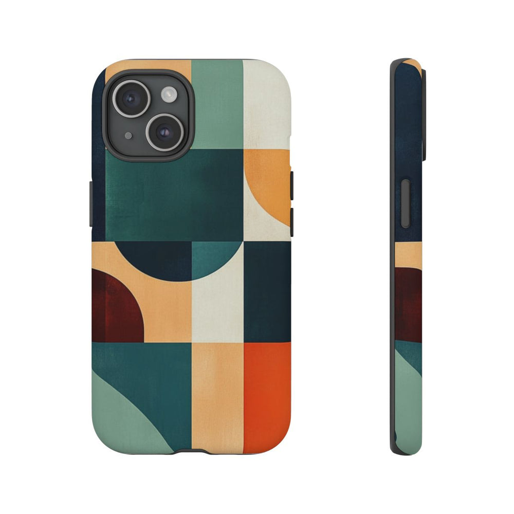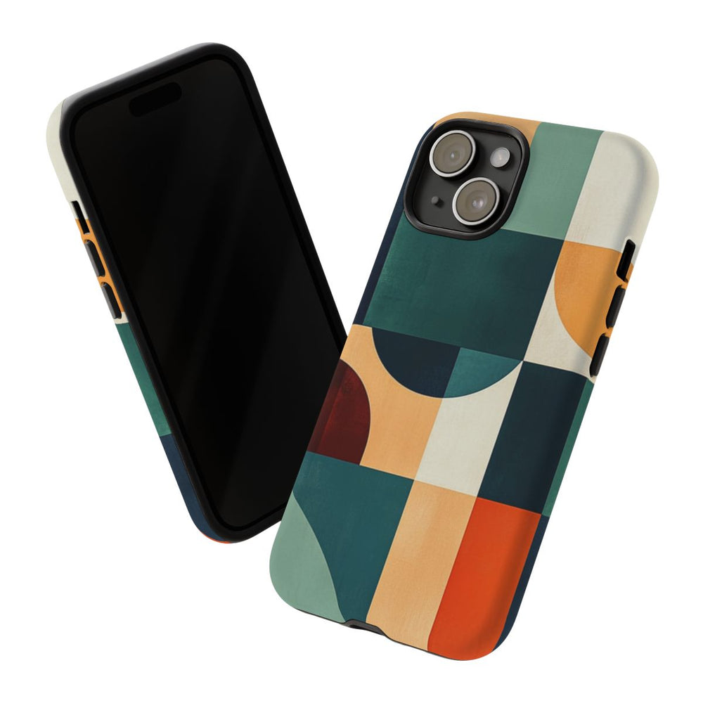 Dit ontwerp toont een abstracte compositie van geometrische vormen zoals rechthoeken, vierkanten, cirkels en halve cirkels. De kleurencombinatie bestaat uit diep marineblauw, teal, gedempt groen, gebrand oranje, oker en crème. De vormen zijn in een evenwichtig, rasterachtig patroon geplaatst met gladde texturen en strakke lijnen. De print is aangebracht op een stevige, matte hoes met dubbele laag van polycarbonaat en TPU, geschikt voor draadloos opladen.