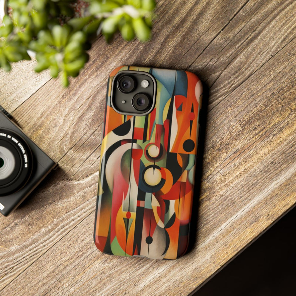 Dit ontwerp toont een abstracte compositie van geometrische vormen met scherpe hoeken en vloeiende lijnen. De afbeelding is uitgevoerd in een rijk kleurenpalet met overwegend warme tinten zoals oranje, rood en geel, afgewisseld met zwart en gedempte groentinten. De overlappende en in elkaar grijpende vormen zorgen voor een dynamisch en intrigerend visueel effect. De afbeelding is gedrukt op een glanzend, stevig hoesje met een dubbele laag van polycarbonaat en TPU. Dit biedt extra bescherming en ondersteunt draadloos opladen.
