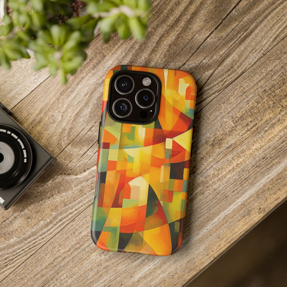 Dit ontwerp bestaat uit een abstracte, geometrische compositie met overlappende vormen en scherpe lijnen. De afbeelding gebruikt een rijk kleurenpalet met vooral warme tinten als oranje, geel en rood, aangevuld met accenten van groen en blauw. De vormen variëren van rechthoeken tot ronde lijnen, wat zorgt voor een dynamisch en boeiend visueel effect. De print is aangebracht op een mat telefoonhoesje van polycarbonaat en TPU met een dubbele laag voor extra bescherming en duurzaamheid. Het hoesje ondersteunt draadloos opladen en is bestand tegen weersinvloeden.