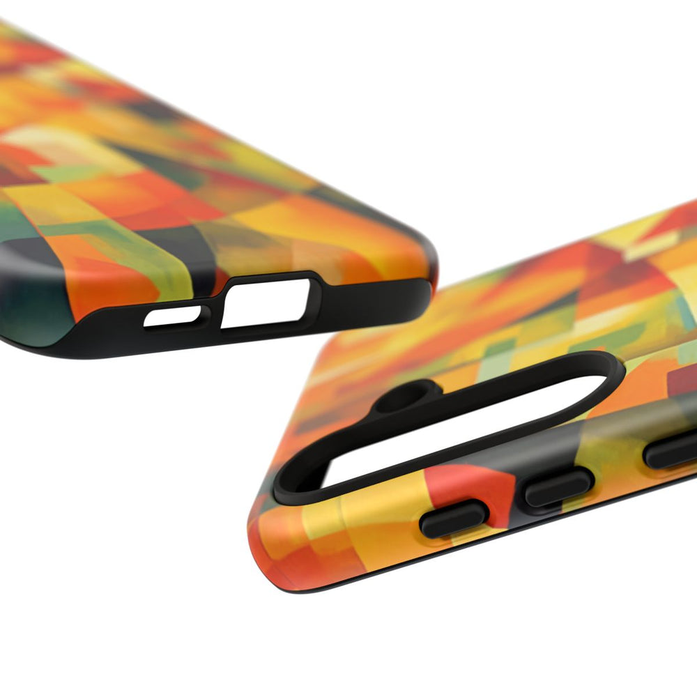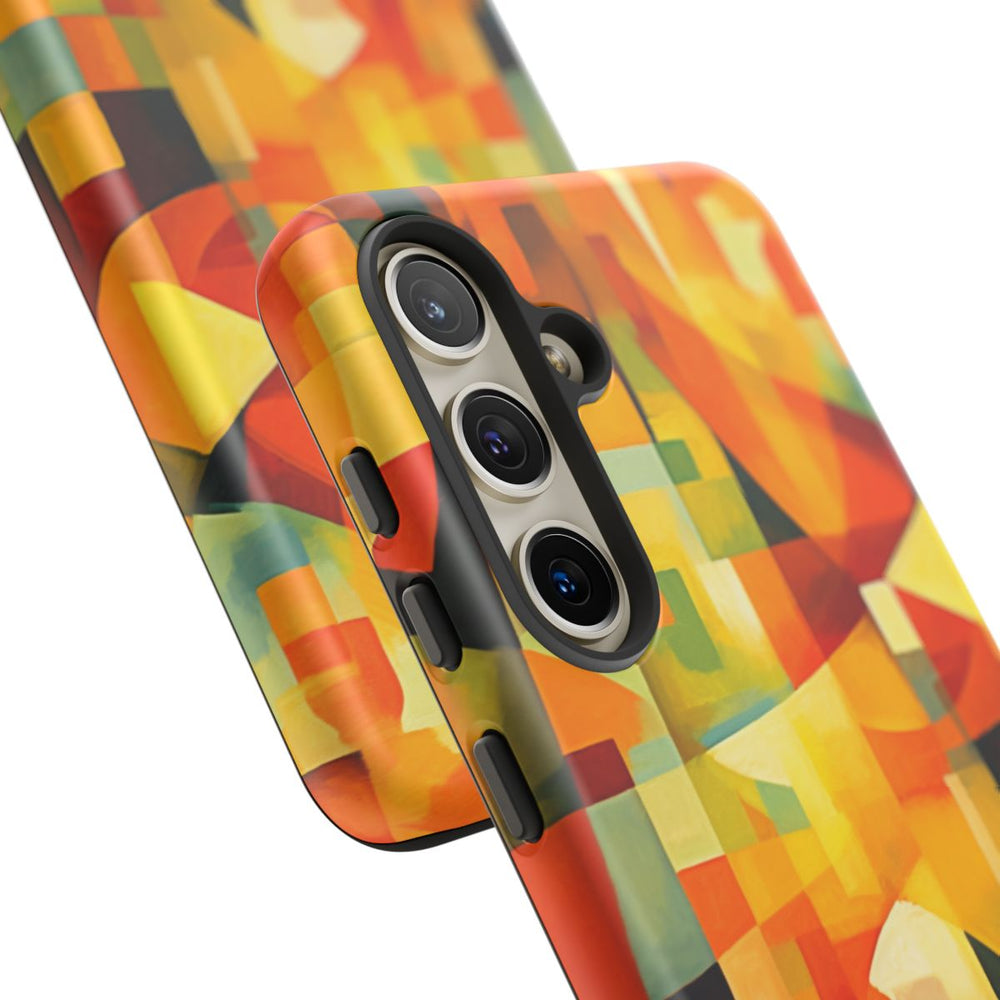 Dit ontwerp bestaat uit een abstracte, geometrische compositie met overlappende vormen en scherpe lijnen. De afbeelding gebruikt een rijk kleurenpalet met vooral warme tinten als oranje, geel en rood, aangevuld met accenten van groen en blauw. De vormen variëren van rechthoeken tot ronde lijnen, wat zorgt voor een dynamisch en boeiend visueel effect. De print is aangebracht op een mat telefoonhoesje van polycarbonaat en TPU met een dubbele laag voor extra bescherming en duurzaamheid. Het hoesje ondersteunt draadloos opladen en is bestand tegen weersinvloeden.