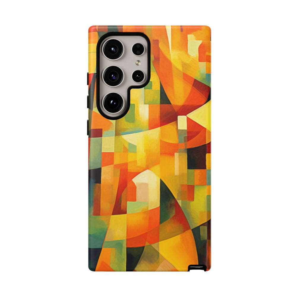 Dit ontwerp bestaat uit een abstracte, geometrische compositie met overlappende vormen en scherpe lijnen. De afbeelding gebruikt een rijk kleurenpalet met vooral warme tinten als oranje, geel en rood, aangevuld met accenten van groen en blauw. De vormen variëren van rechthoeken tot ronde lijnen, wat zorgt voor een dynamisch en boeiend visueel effect. De print is aangebracht op een mat telefoonhoesje van polycarbonaat en TPU met een dubbele laag voor extra bescherming en duurzaamheid. Het hoesje ondersteunt draadloos opladen en is bestand tegen weersinvloeden.